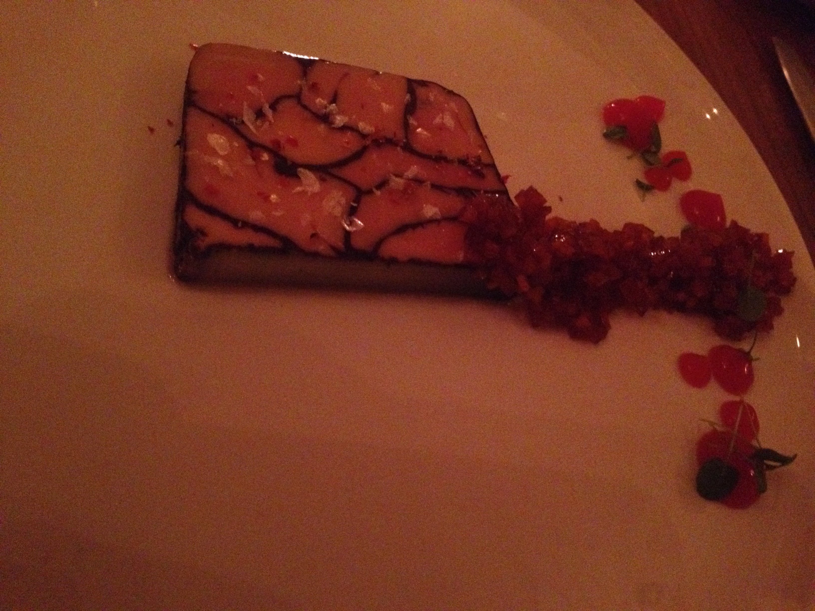 I started with the foie gras terrine appetizer, which looked like an interesting slab of marble when it came out, due to the cocoa that was pressed in there with the foie. The citrus from the blood orange was a nice touch, but ultimately, I felt like the foie didn’t really shine through. Don’t get me wrong, chocolate + citrus is delicious, but if I’m being charged for foie, I want to be able to taste it. (It would have been real killer had one side been torched or bruleed or something for a little bit of that roasted foie flavor).