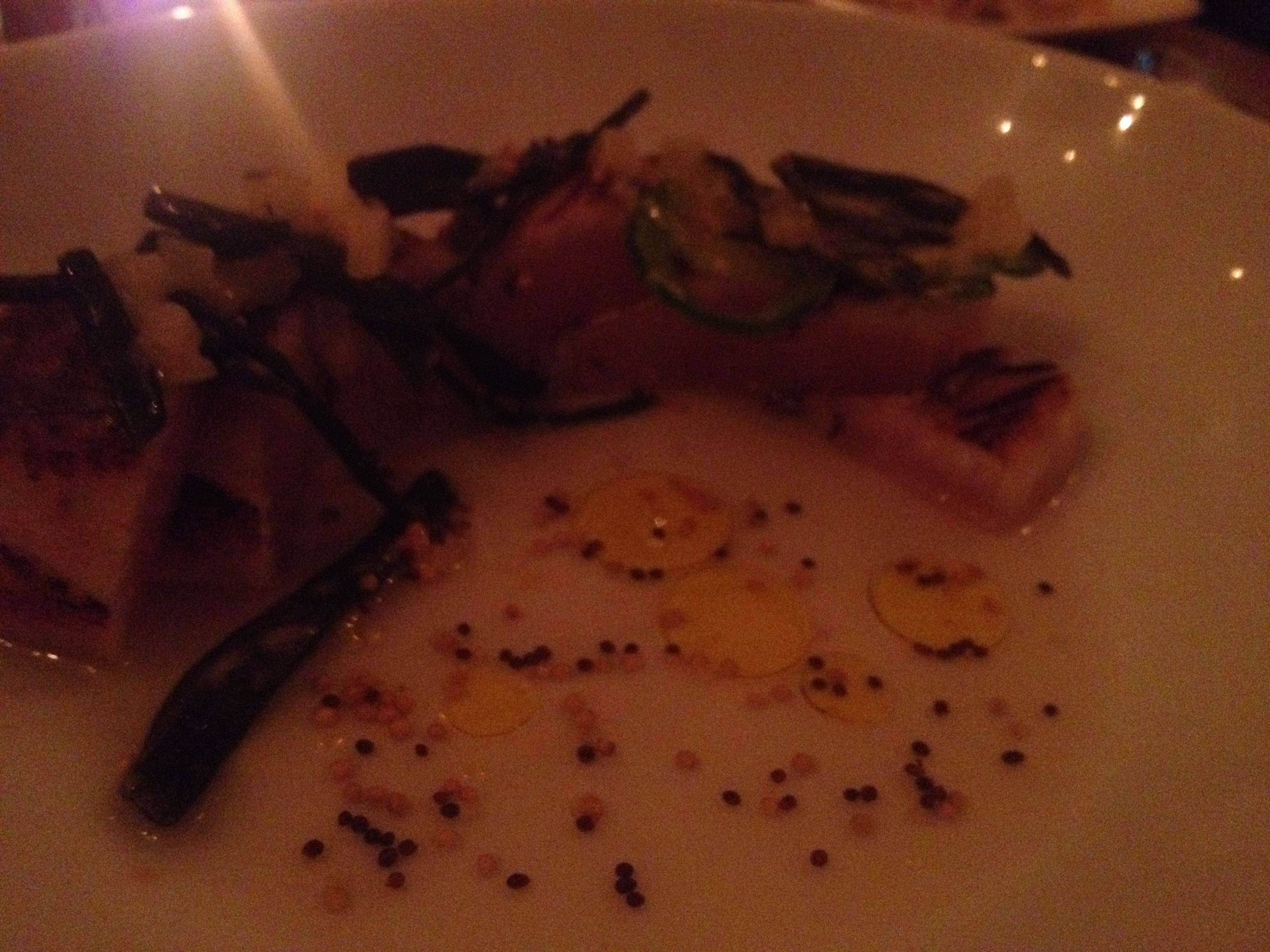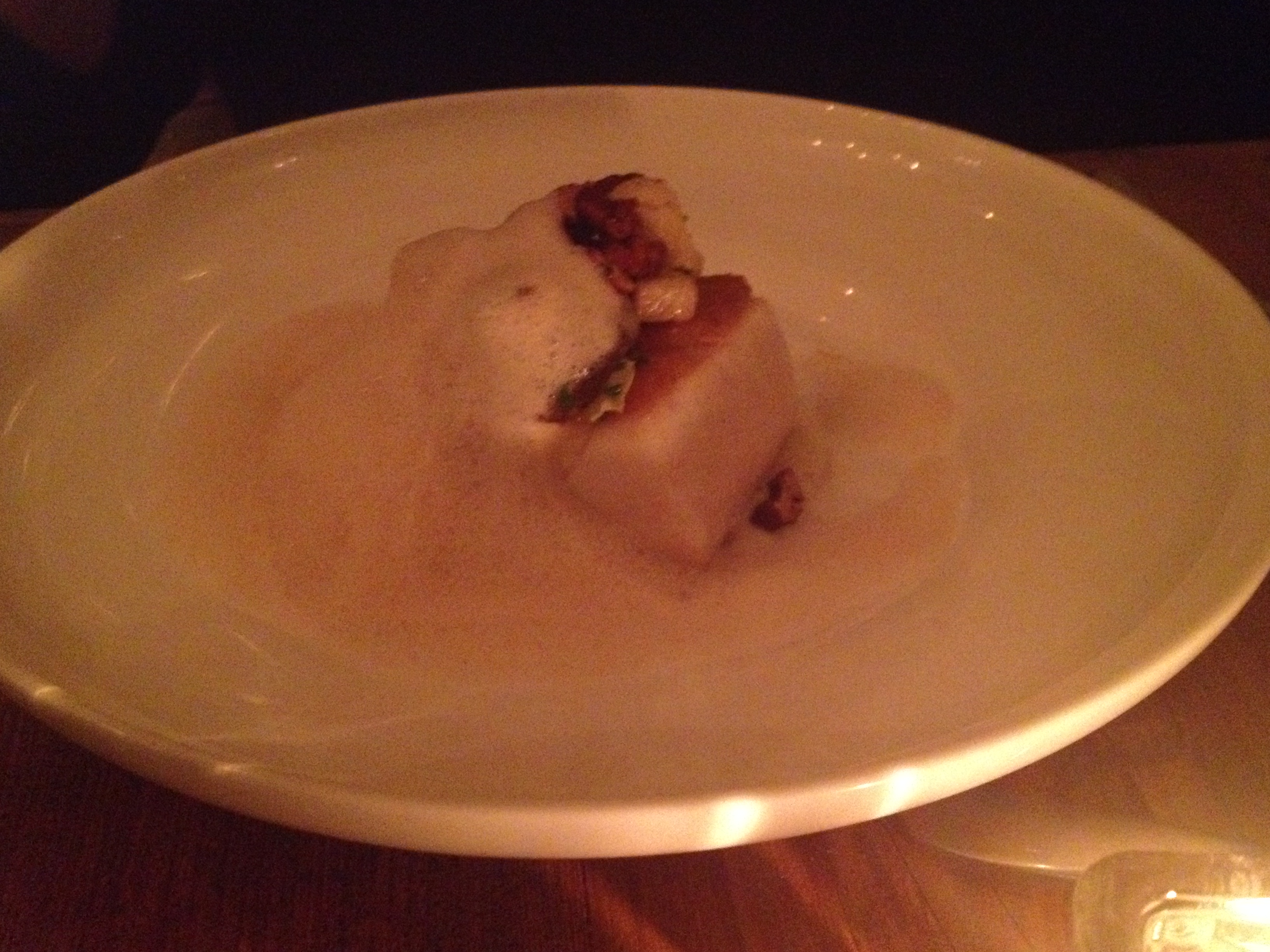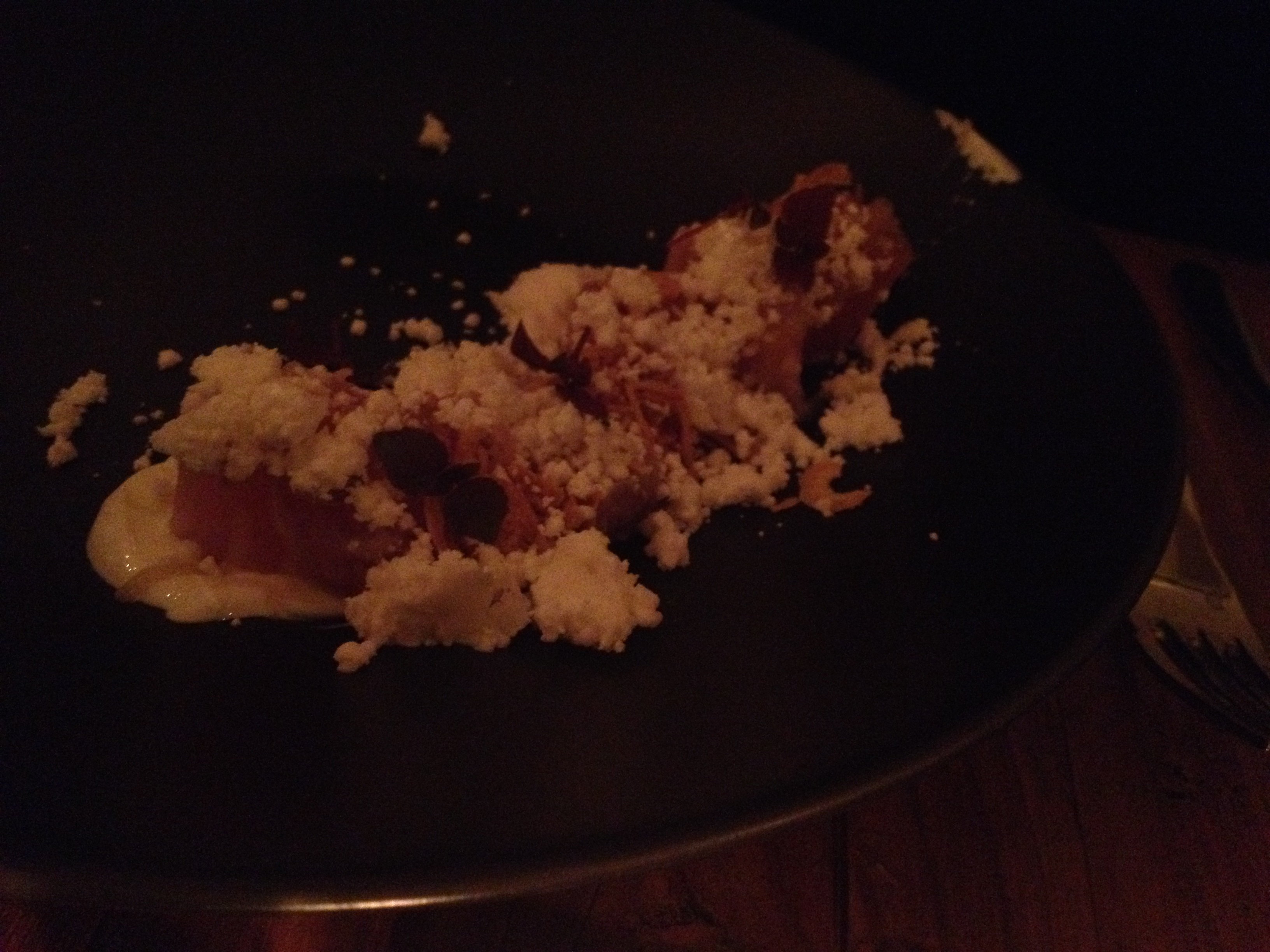 g did the tuna + asian pear + horse radish. This was a peculiar dish in that the raw fish was coupled with frozen-then-shaved horseradish. While this was texturally interesting (it was fun to have frozen horseradish melt in your mouth and slowly pick up in spice level), it was odd with the fish because the cold temperature muted the beautiful fish flavors. Similar to how you’d never want sashimi to be served too cold, this crudo should also not be too cold. A fun effect, but overall, it probably hurt the dish.