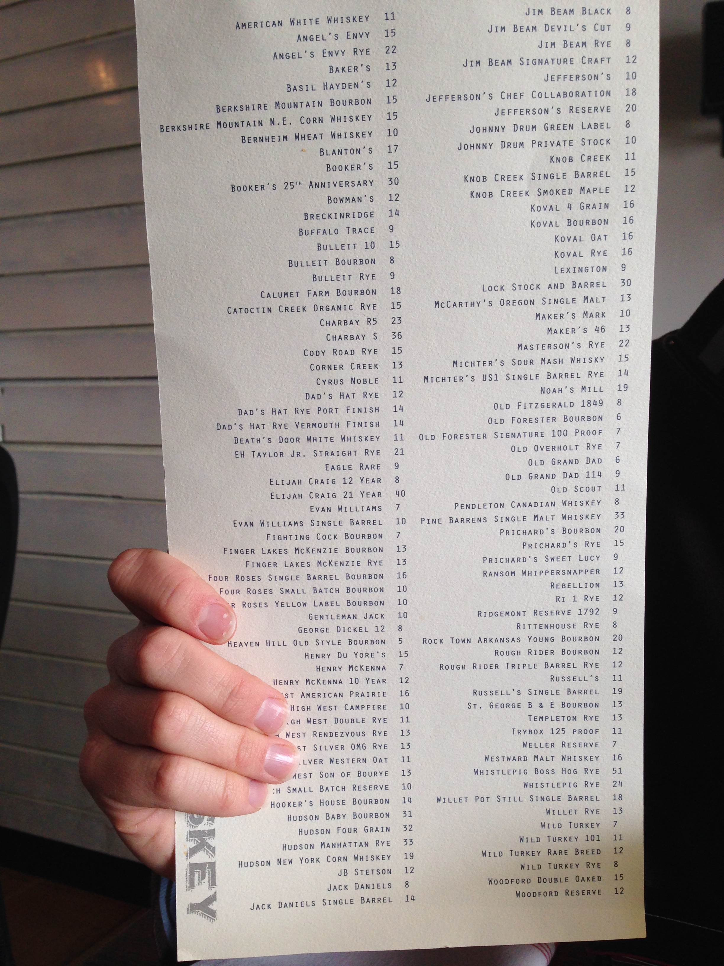and they have an exhaustive list of bourbons! some of them downright pricey, but might be worth a stop if you have a hankering for some whisky. Their sauv blanc that was on tap was not bad for $6!