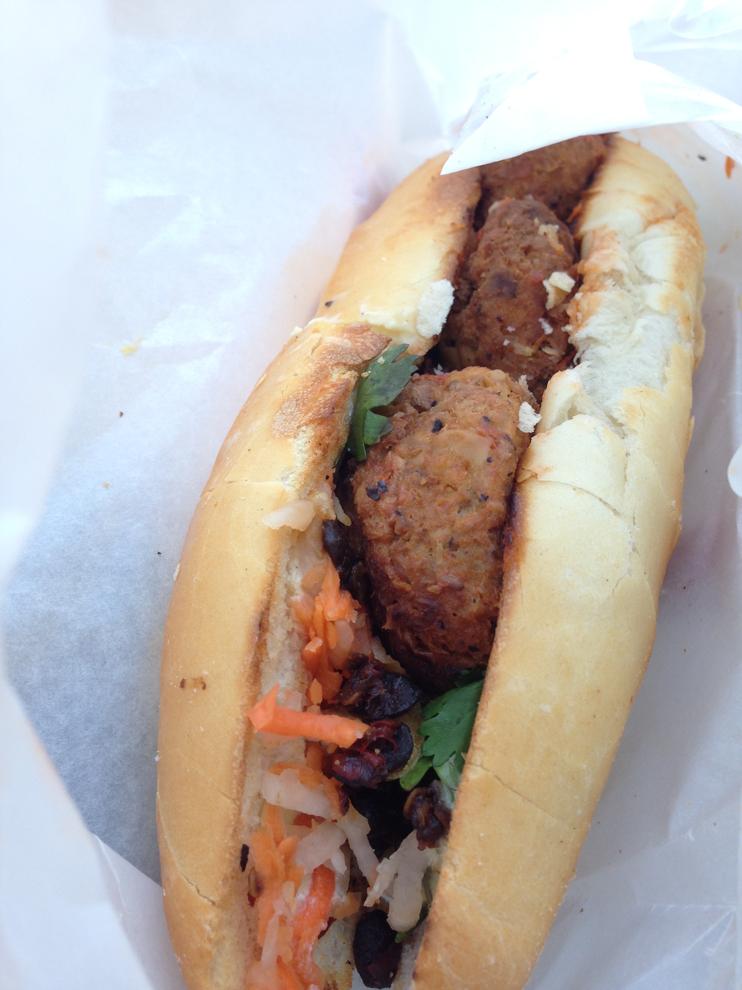 t says: a was down for a quick trip to a food truck today and noted that Kung Fu Hoagie had set up shop on 38th and Chestnut-ish. We tracked them down and had them whip up a couple of their banh mi sandwiches. Personally, I went for the tofu “meatball”, figuring that they weren’t trying to imitate real meat, rather, just moosh together some tofu and seasoning and go from there. a was bold and went for the “beef”. I don’t know how his was, but check out mine: