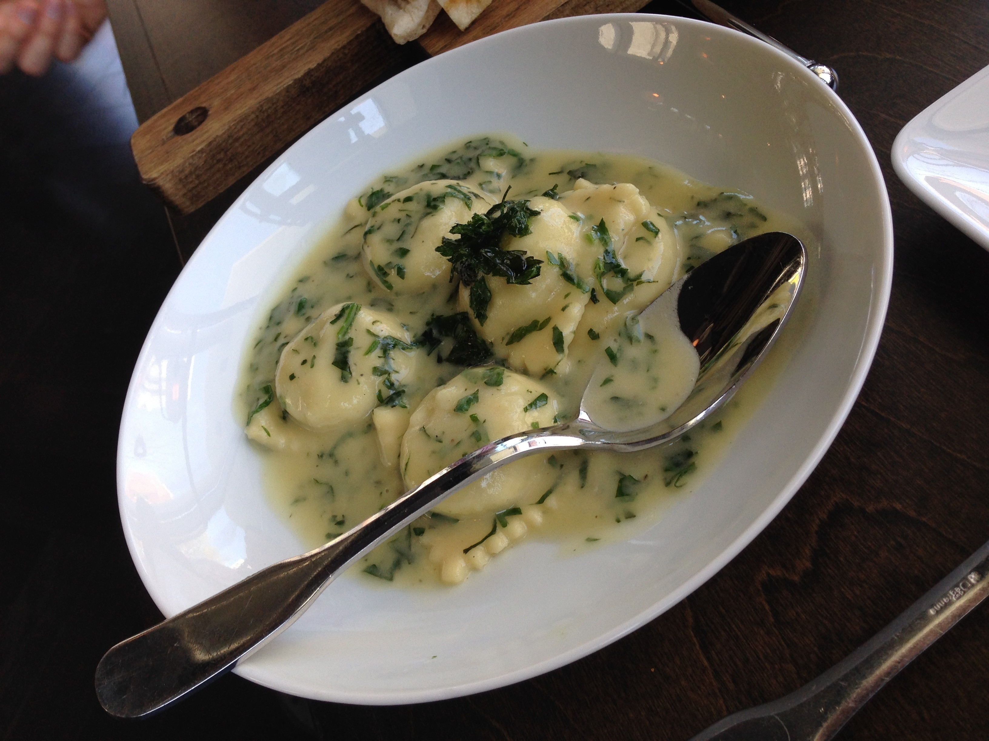 the ravioli of the day, featuring rabbit, was pretty delicious, albeit small. the flavor was interesting because it had a very potent herbed essence that hit me in the back of my mouth/palate exactly like the secret-ingredient-laden KFC original recipe. i’m not sure if zavino would want that, but i know i loved it. a agreed with its chickenyness – not necessarily the KFC-ness, but he, too, liked it quite a bit.