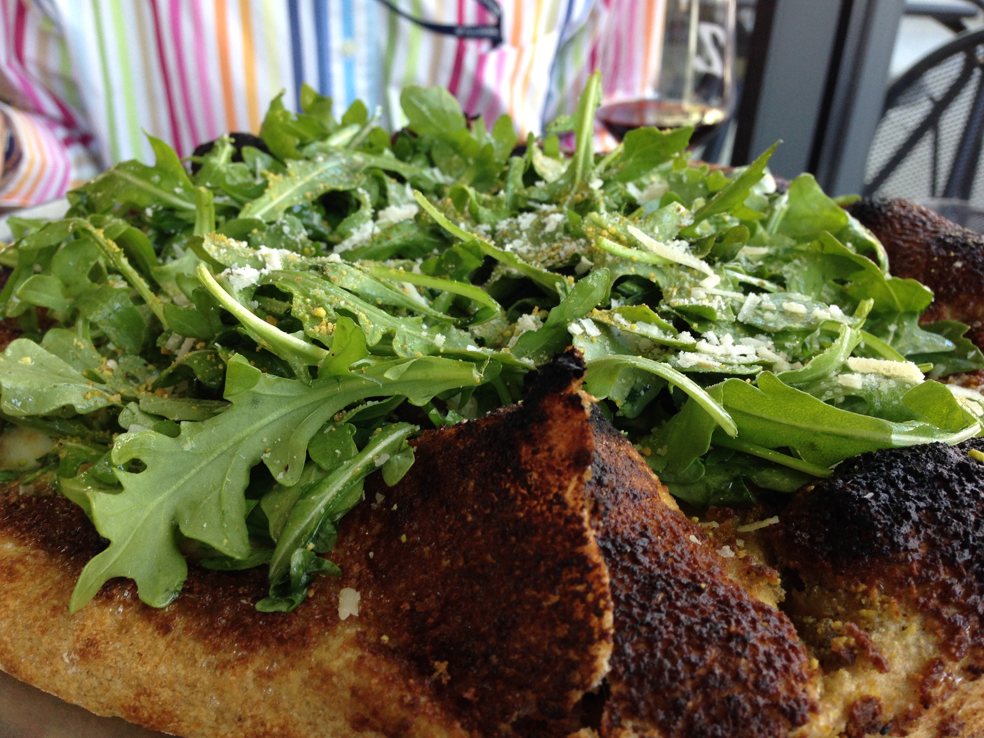 the pizza was a site to behold. “the stache” as it’s called had a gloriously prepared whole wheat crust, as well as pesto and arugula. i can see how some of the previous critics laid into the doughiness of the crust (it’s not paper thin and has some squish to it), but I kind of like that! that’s pizza! this isn’t just some thin slice of grilled bread with toppings – this is pizza! a decided that he and v are going to totally rip this combination of ingredients for their future homemade pizzas – he just has to convince v to use their pizza stone.