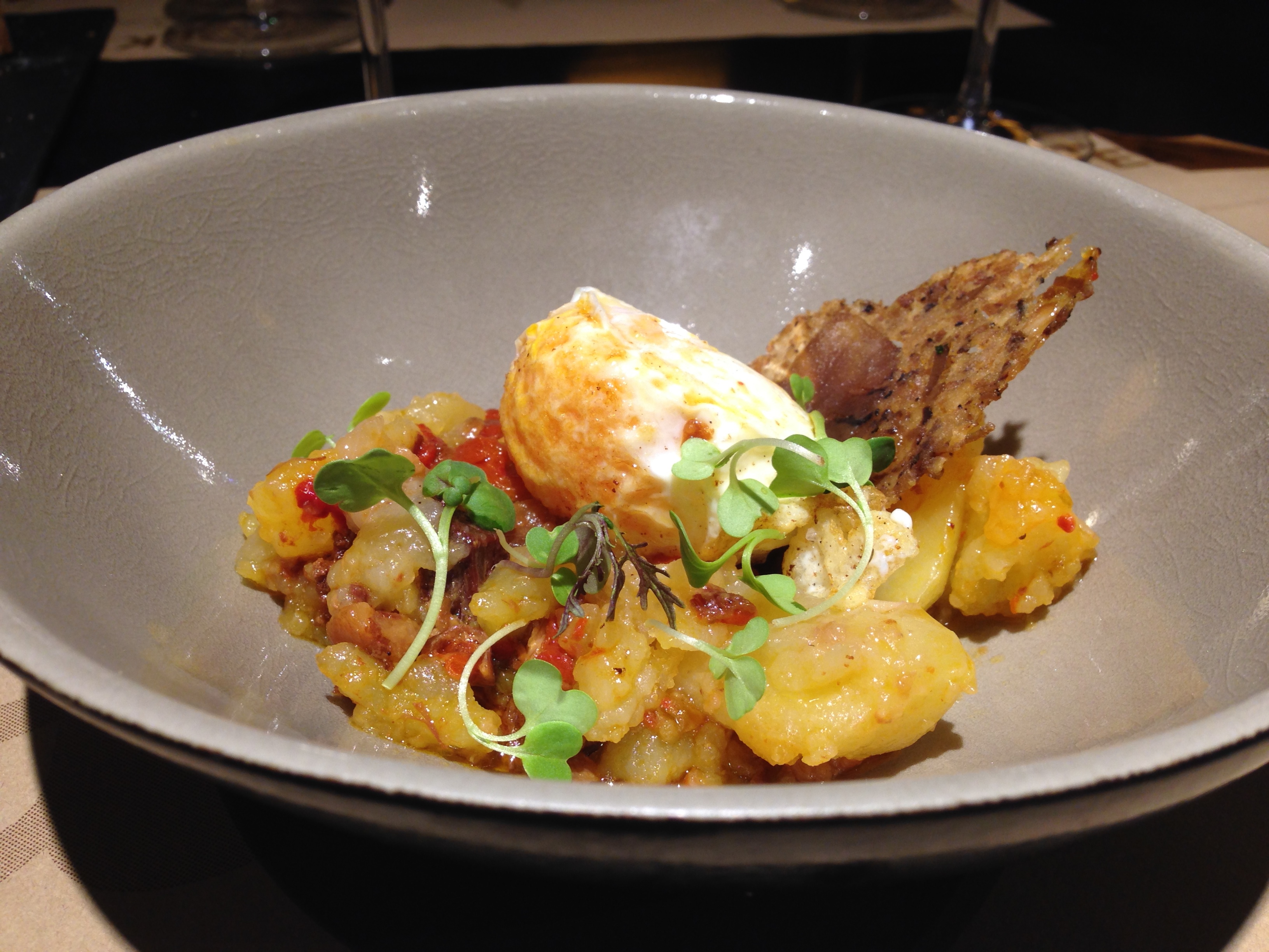 Oh – did I mention Bilbao also has delicious food? Our first night, we ate at Bascook, a restaurant that’s getting some attention for its blend of traditional basque cuisine with some “international flavors” and a smidge of fussy gastronomy. Whatever the concoction, let’s just say that this “tomato soup with pig” amuse bouche was amazing. Tomato, cucumber, and likely some red onion and fried pig … a stunning way to start the meal.