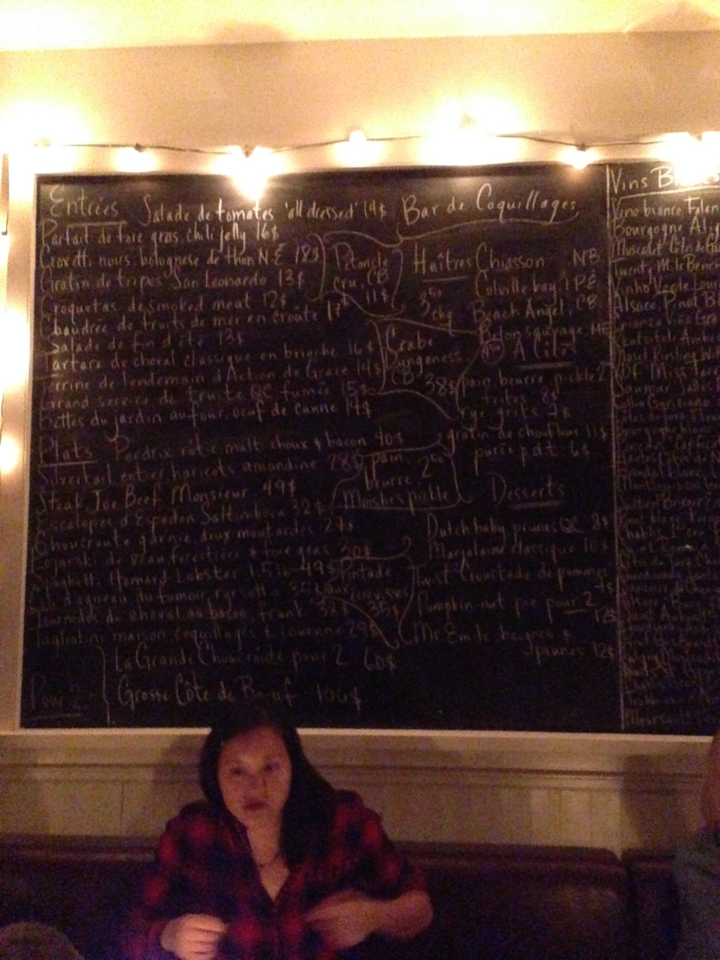 Above is the menu for Joe Beef (and some random stranger). None of the pictures of the food turned out, so I’ll just say my piece here … Joe Beef is VERY over-hyped. It does not serve the “best food in the world”, or whatever accolade that Dave Chang put on it. Sure, it serves “good food”, but “best” is a tough superlative to attach; it’s good raw ingredients, done very nicely, and with a dash of “extreme”. For instance, the steaks are huge. Foie is everywhere. They use off cuts of meat all the time. So … it’s like [what I think would be] a chef’s dream come true: good ingredients, done in a not-fussy manner, but done very well, and served in a very friendly, bar-like environment. Unfortunately, Joe Beef is less a gathering place for locals, rather a tourist attraction for people looking to get that stupid Foie Double-down (google it). So what did we eat? g went for “Lobster Spaghetti” … and despite my previous rant, I now have to admit that it blew her face off. She initially said “gee, this is huge – I’m totally taking some of this home” when it first hit the table, and then she took a bite, and then she completely blacked out for about 15 minutes, and when she came to, her pasta was gone. And it was a HUGE dish. It had 1.5 lbs of lobster on it! I did sneak some, and it was quite tasty – not like elegant, complex or anything like that – it was just straight-up “good” – I’m not a huge lobster fan, so I didn’t also lose control, but I can see how some people might (g chimes in: i feel a little ashamed – i mean – how did I eat it all?). It’s rare for g to eat herself into a stomachache, so this is pretty high praise for Mr. Beef. As for me, I asked the server for “something piggy” – and he instantly responded “go for sauerkraut” … so I did. Despite not having anything piggy in the title, it features two cuts of pork and two giant sausages. It was quite solid – it was like something out of Cochon’s playbook – once again – my socks remained on my feet, but I was net-happy with what I got.