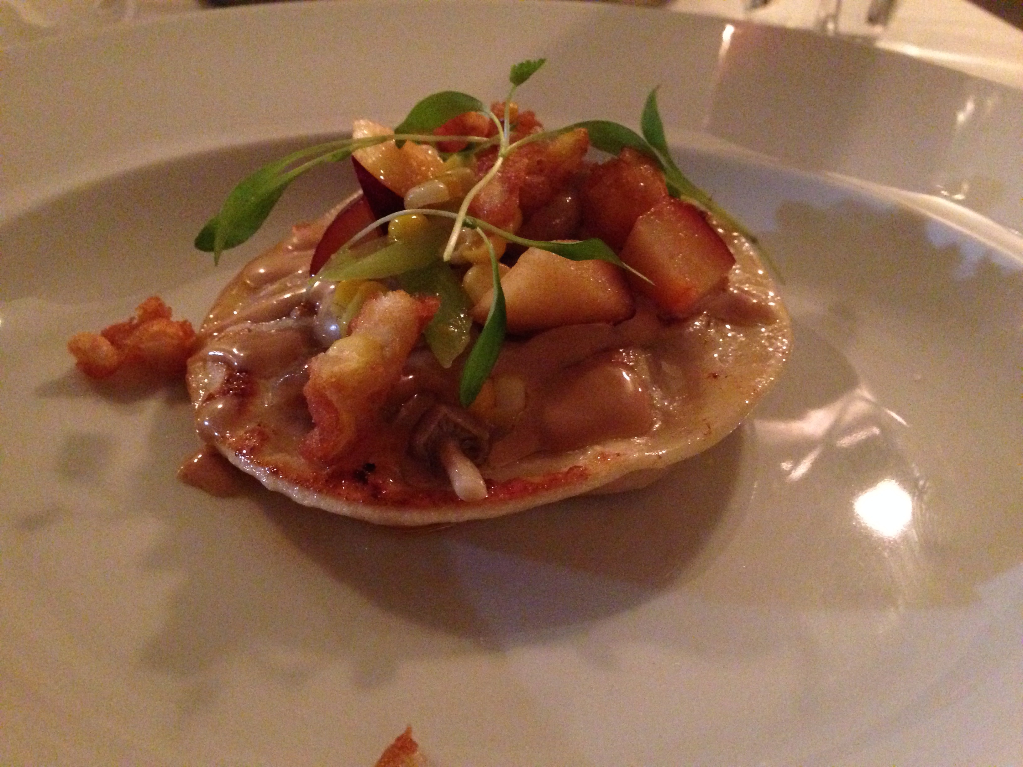 This is a “dumpling” topped with mushrooms, fruit, corn, and other various things. It was like an Asian dumpling, but take every possible flavor and make it more pronounced, but at the same time, balanced. Like even if I had all these ingredients on hand, I doubt I would ever be able to strike the balance of sweet (from fruit and corn) with the savory. I would have eaten three of these … and trust me … I love bashing crappy wonton-wannabes, which this was not.