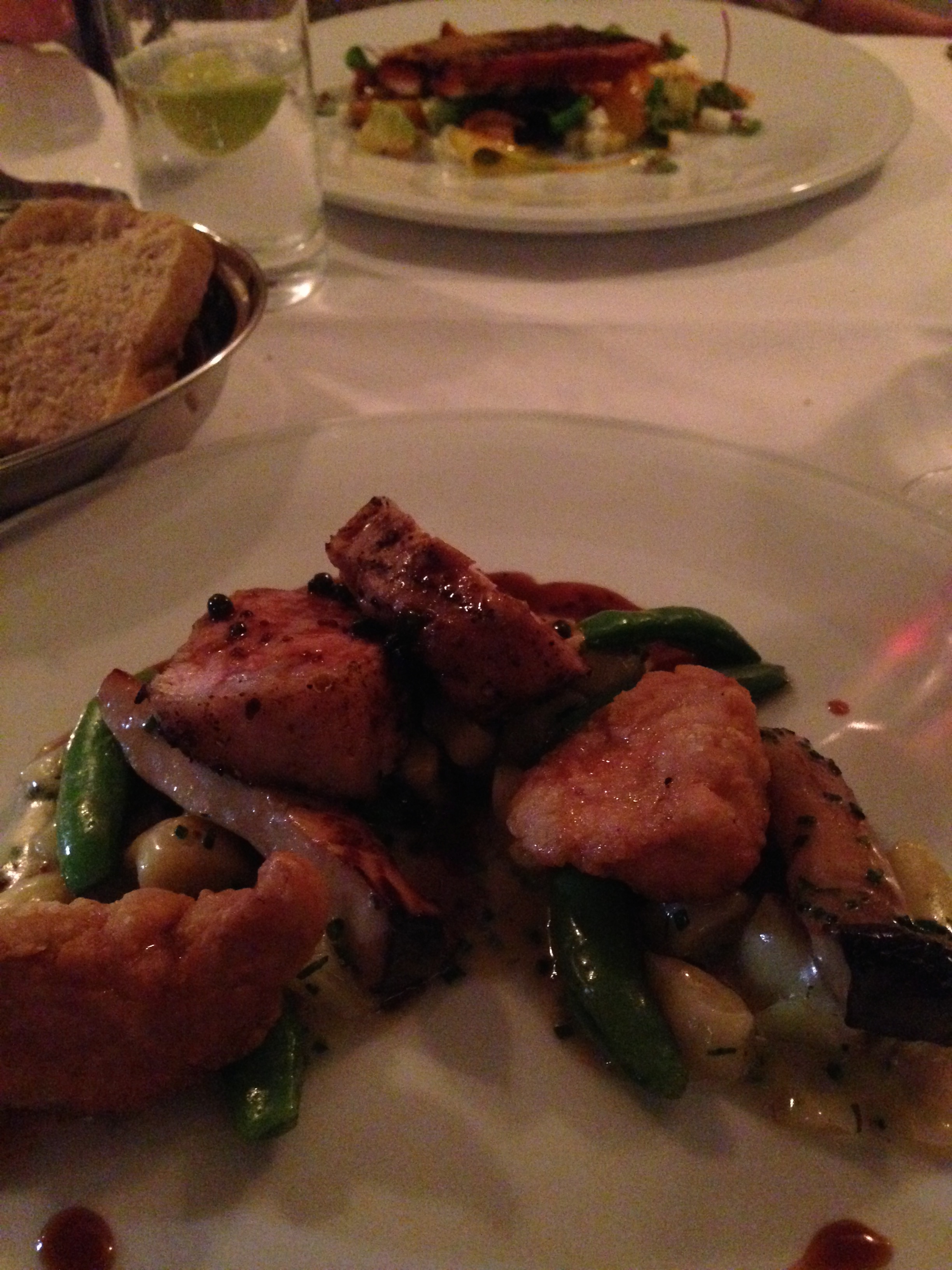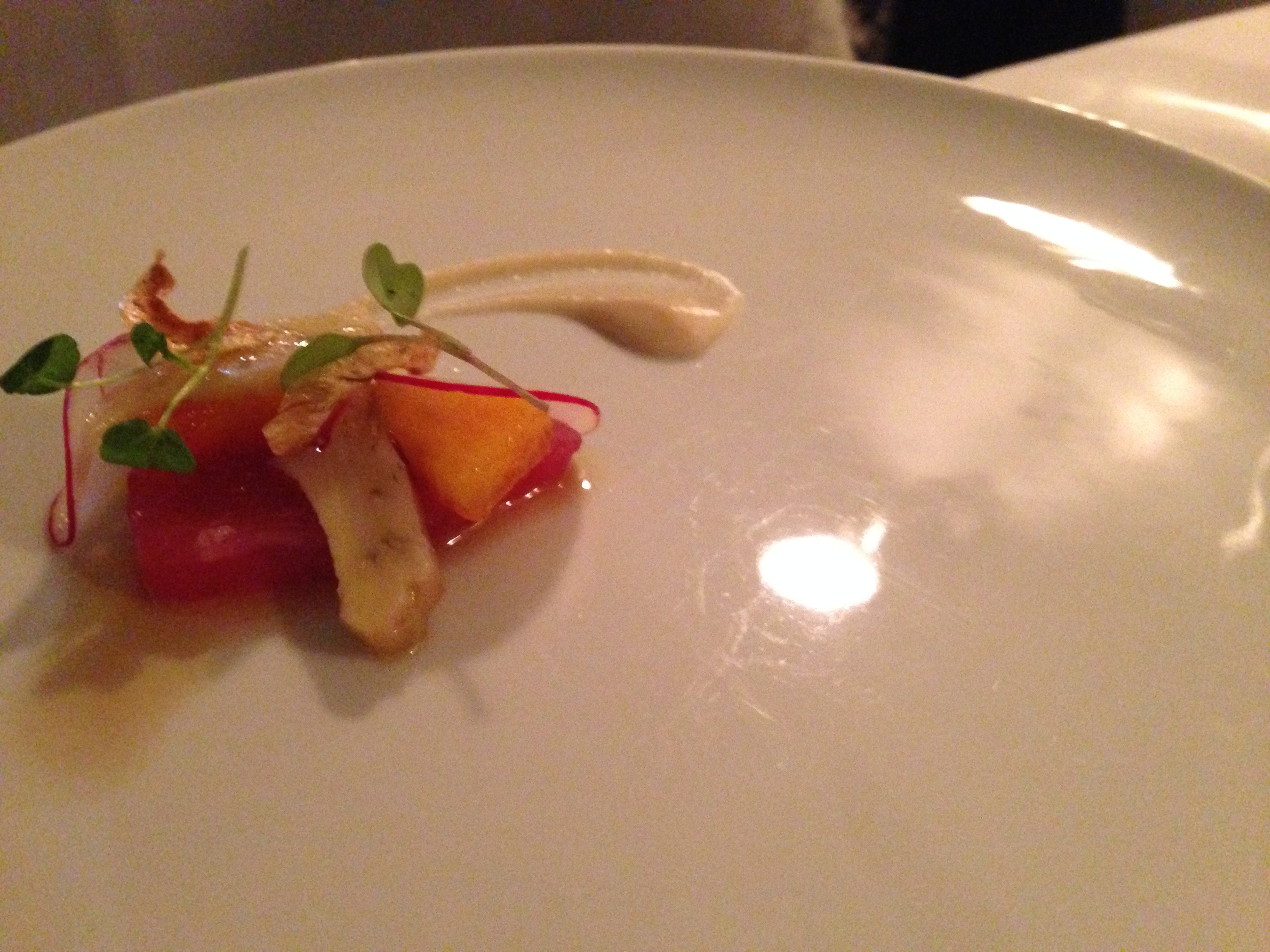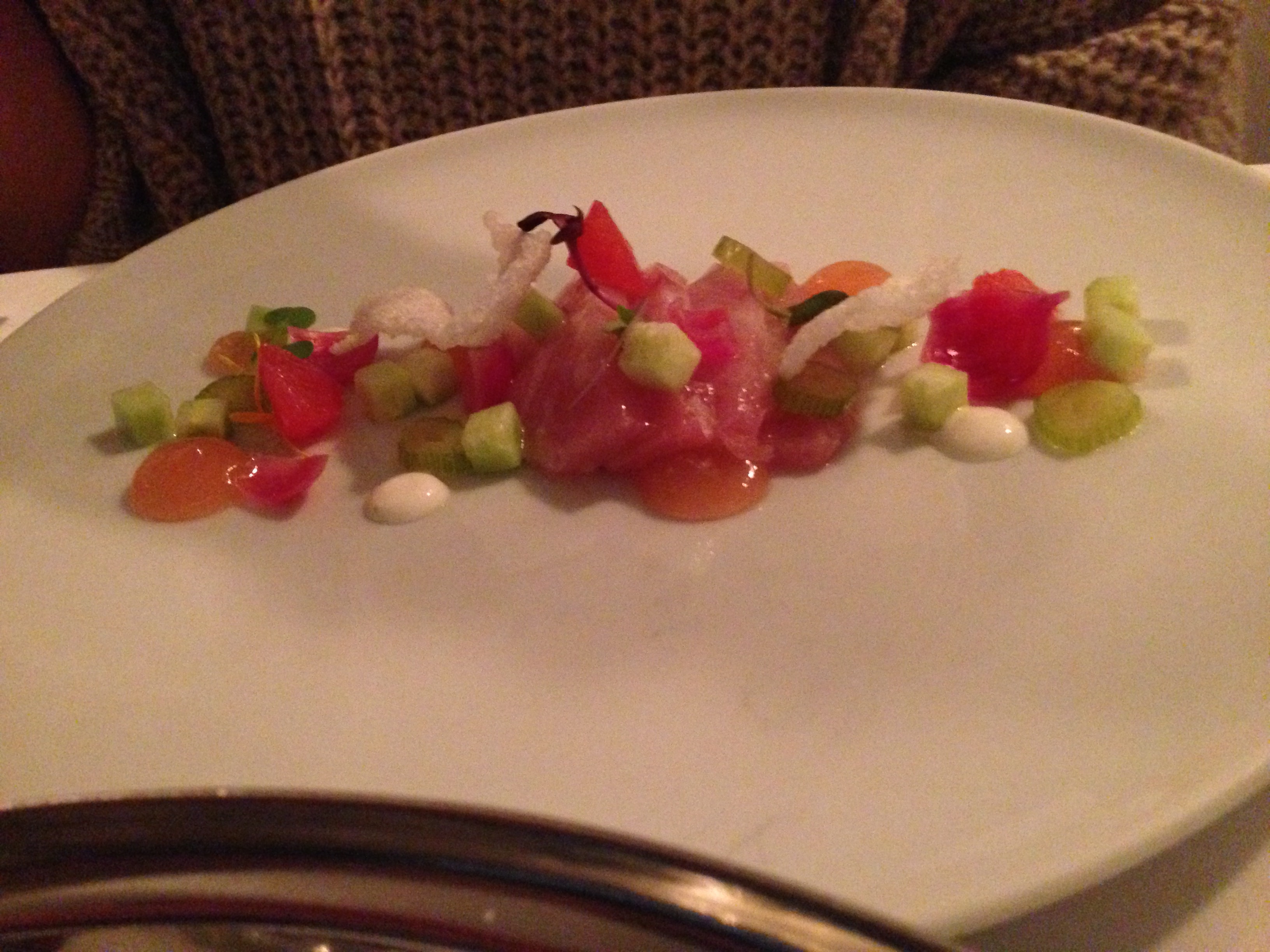 Tuna amuse. They lose points for presenting an amuse on a GIANT plate. That’s pretentious and stupid. Don’t do that. They also lose points for it being larger than one bite. BUT … they instantly gain it back because this was perfect, and I was happy I had a second bite left after my first. I had no idea what was in it but damn they nailed it.