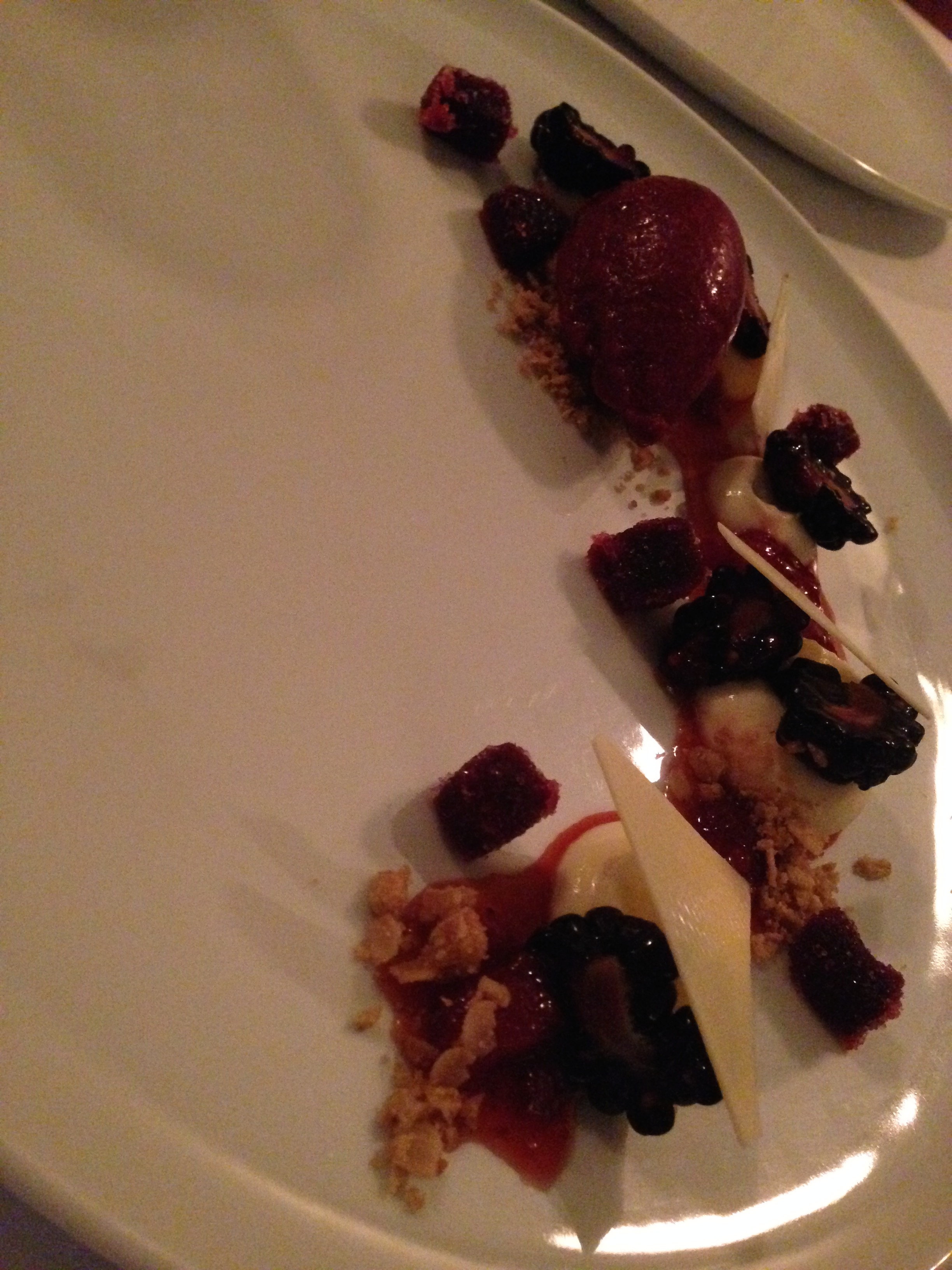 The “veal dish”, which was a special, rivaled the best thing I’ve eaten in the past few months (which was Fond’s Pork Belly). Perfect sweetbreads. Perfect veal medallions. Perfect greens. Perfect gnocchi. I died and went to heaven. And then I took a sip of the aforementioned Bourgogne, and then I went straight to hell, because to taste that good must be the work of the devil. Drawback? I have none. In the background was g’s fish. I completely forget what she ate, as I blacked out like g’s experience with Joe Beef’s lobster spaghetti, so anything g said during that time, I can’t remember … Oh, and did I mention that they gave me a non-serrated steak knife! Hooray!! I mean, it could have used a sharpening, but at least it shows that someone is taking pride in their work so as not to force me to tear it apart with jagged points. Very nice.