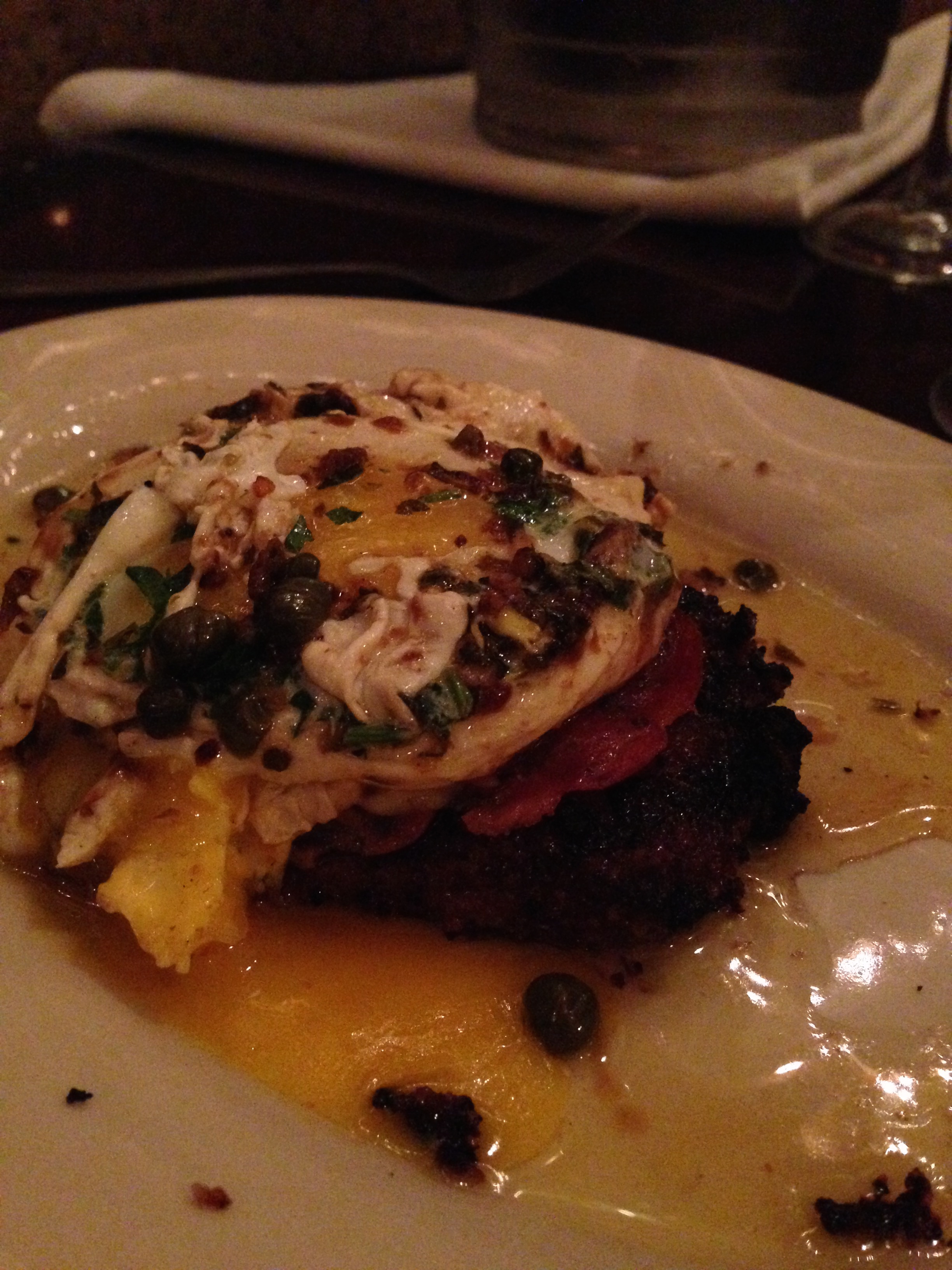 ah, yes – a steak hides underneat that egg. g demolished it. it’s always good here – but don’t think something like a refined piece of meat cooked perfectly medium rare, meant to stand alone – this is a fixed-up piece of meat with a ton of additions.