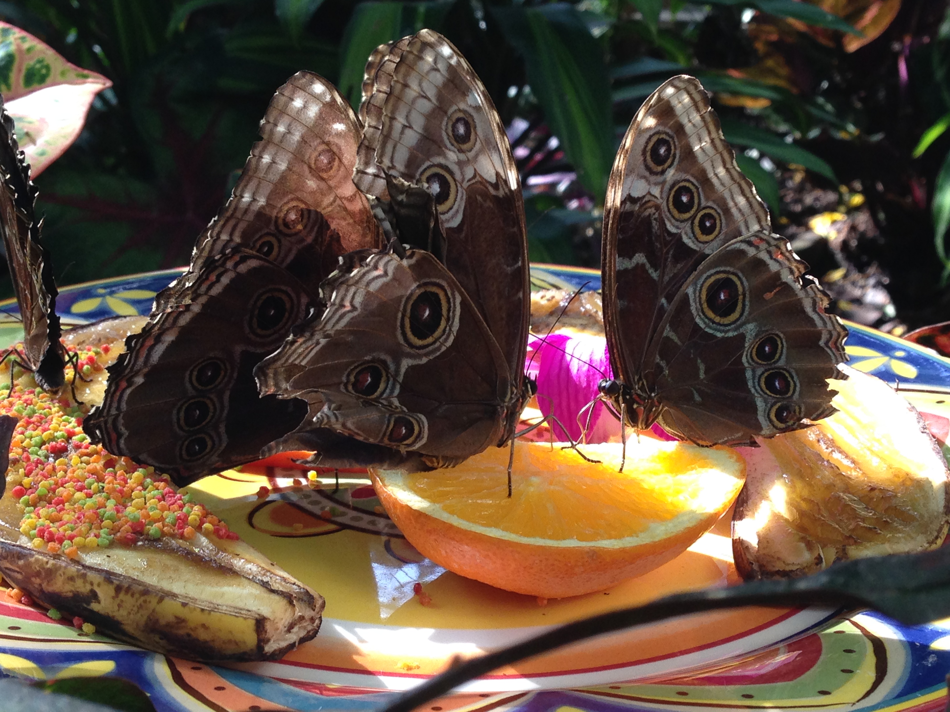 Like any good Key West tourist, we visited the butterfly conservatory. We expected this thing to be quite a letdown – I mean how many butterflies would they actually let you frolick through? Answer: a helluvalot! There were tons! But a lot were sneaky, because they’d look like this when they were perched among the vegetation (they put out some plates of fruit to make them more recognizable) …