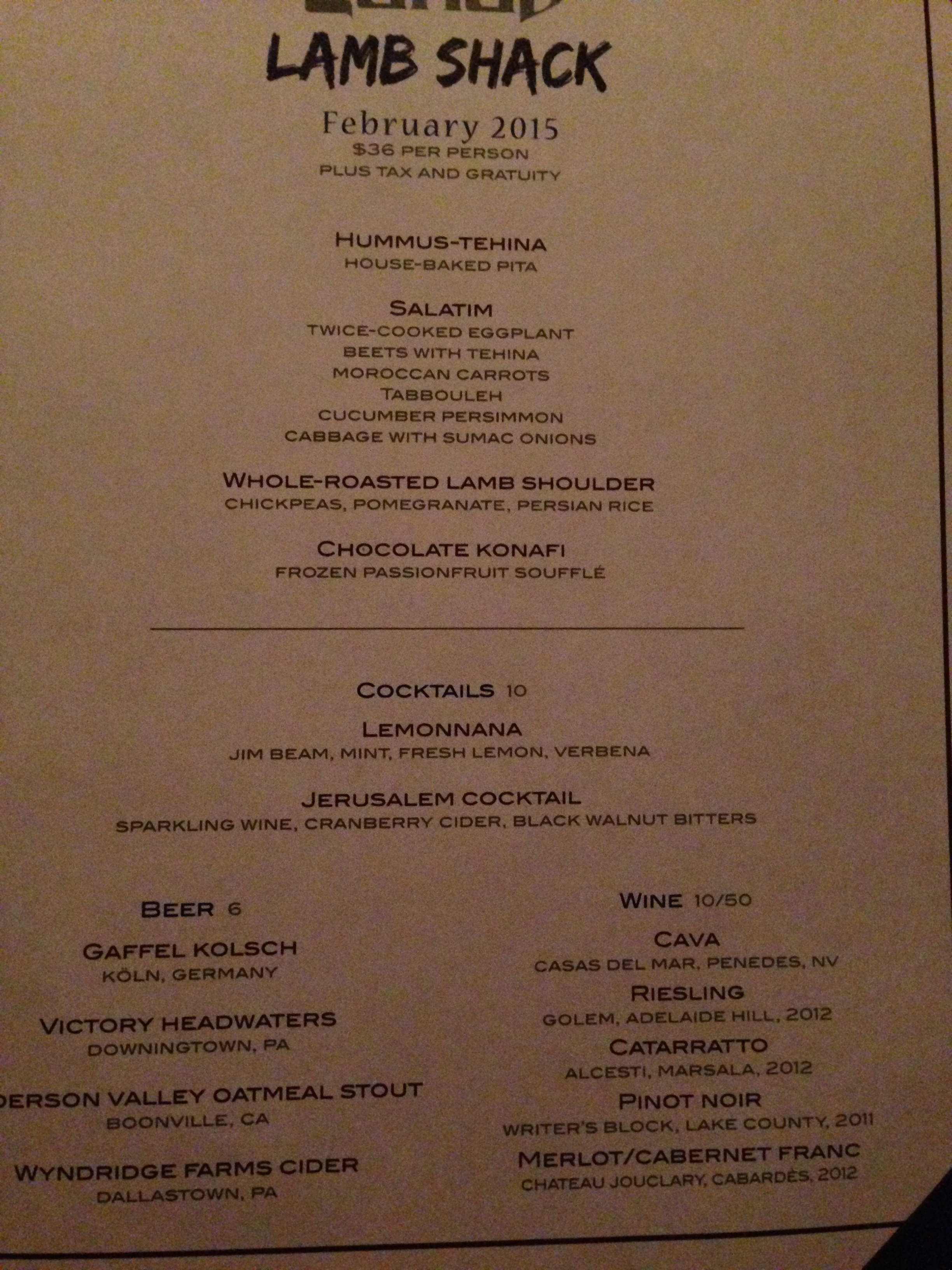 February 2015, Wednesday Dinner, Party of 4. Oh yes, we rocked out at the Lamb Shack (that’s where it’s at). And it was awesome. Take a look at that menu and just start drooling. Mmmmmmm. And one of the best parts was that it was BYO!! Super-awesome (we brought a few rieslings and a trusty OR pinot noir)! How’d it taste? You’ll see: