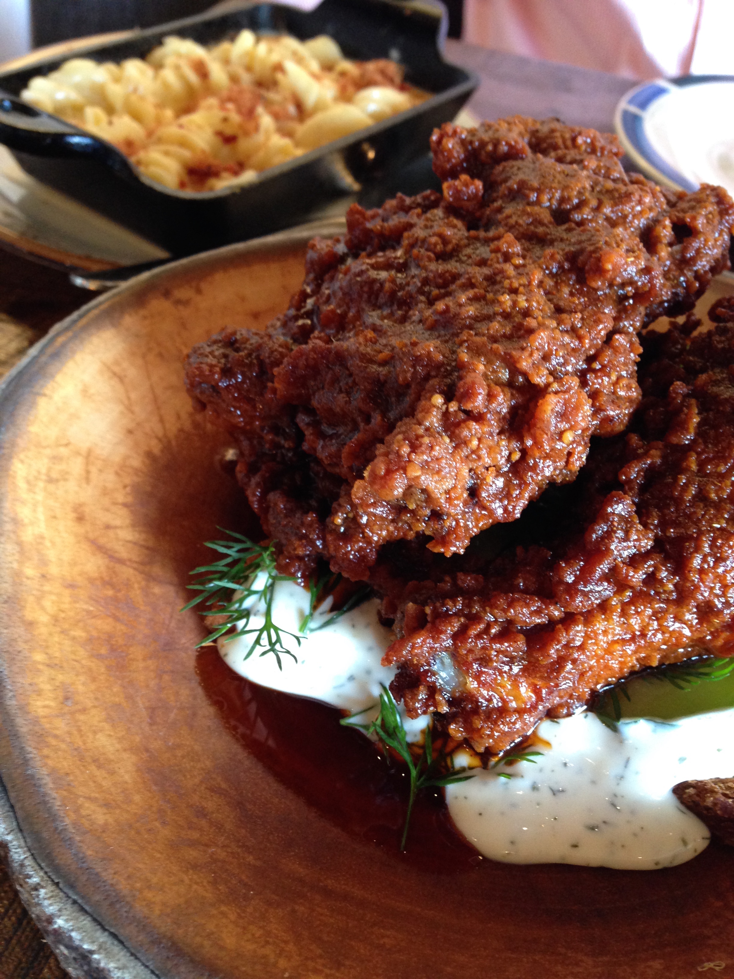 And the main event: the hot chicken! Enter the whiz-pow-bang! A scrumptiously crunchy crust, with a hot sauce that I actually thought was just-right spicy (it was a good kind of spicy – not excessive, diarrhea-causing spicey!). The chicken was also good (as was the dressing and bread), but the real star is the fried goodness. I almost wonder if chicken fingers would be a better presentation to delivery more crust. Oh, and something about this dish reminds me of another dish I had as a youngster, but I couldn’t put my finger on it – one day I’ll remember …