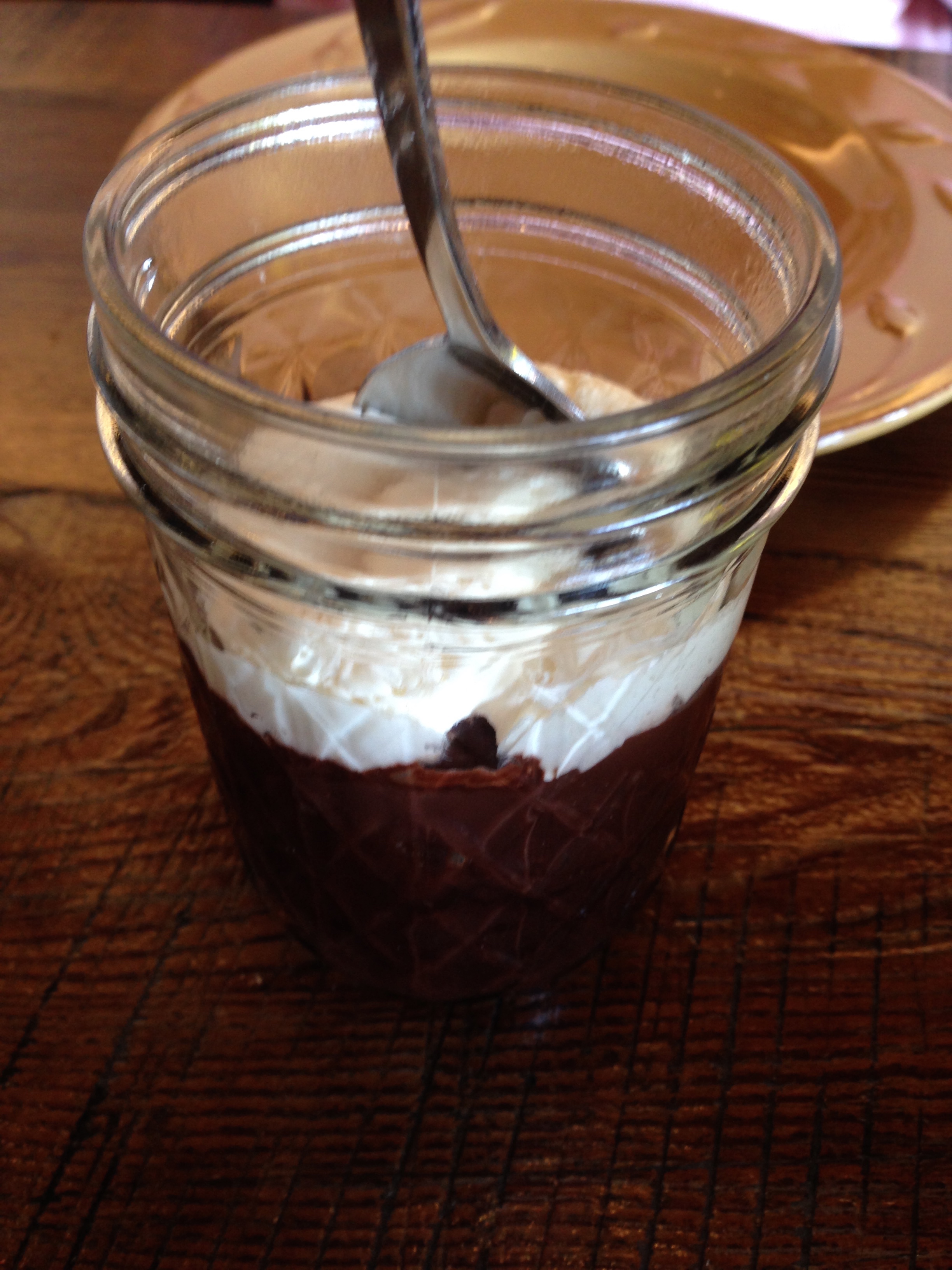 For dessert, we ventured the mud pie. Which came in a jar. BOOOOOOO. It should have been a slice of pie. There needed to be crust – there was no crust! It was brownie pieces, choco pudding, and whipped cream … but no crust! AGH! Sure, it tasted delicious – but it was no mud pie. Giving them a D- for this one. Sorry Sbraga.