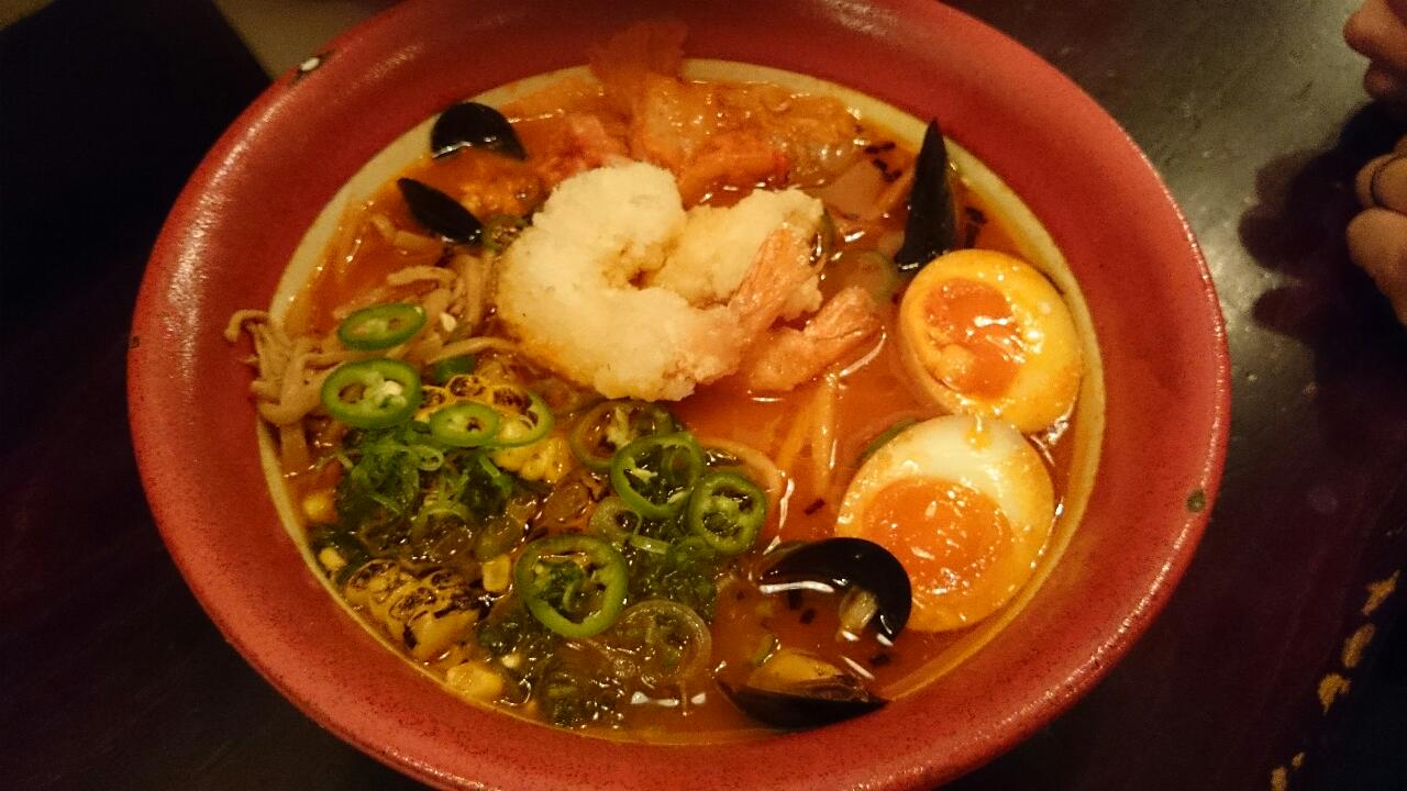 I went to Bone Daddies, which is also around the corner from the last place, Tonkotsu. This place had a line queue that wrapped around the outside of the store. Now, I know that I hate lines, but something told me that this line was going to go fast. And I was right – with a party of one, they seated me within 10 minutes. Of course, they seated me next to another Asian couple along a bar-like area against a wall, and they pretty much treated us a s a party of 3 – they took our order at the same time, served us at the same time, gave us our bill at the same time … But it was fine – because I did befriend them and asked them to take the above picture and email it to me as my trusty iPhone had died right on cue (my iPhone, Alfred, appears to crump at 20% battery nowadays). As an aside, thanks to that couple – they were awesome – we talked about London and ramen and shopping – a fabulous time! Back to the ramen: I would have to say that the noodles were not as good as Tonkotsu – they weren’t as firm, they didn’t have as much of a “taste”/alkalinity. But the broth here was similarly excellent – a savory/spicy kimchi (not as good as other Kimchi I’ve had, but respectable), with tempura shrimp and mussels – it was an eye-opener. (I’m totally stealing the kimchi + seafood idea for future get-togethers) Bone Daddies also gets points for a superior soft-boiled egg. Overall, the dish was DELICIOUS – I inhaled it so fast that I was “sweating like grandpa” – anyone who’s seen our grandpa eat spicy Korean food knows what I’m talking about. In all, a great bowl of “Korean ramen”. And even though I am going to ding Bone Daddies for their subpar noodles, I am going to give them props for their mochi (their matcha mochi was unremarkable, but their chocolate mochi was divine! like eating chocolate frosting in mochi wrapper), and for …