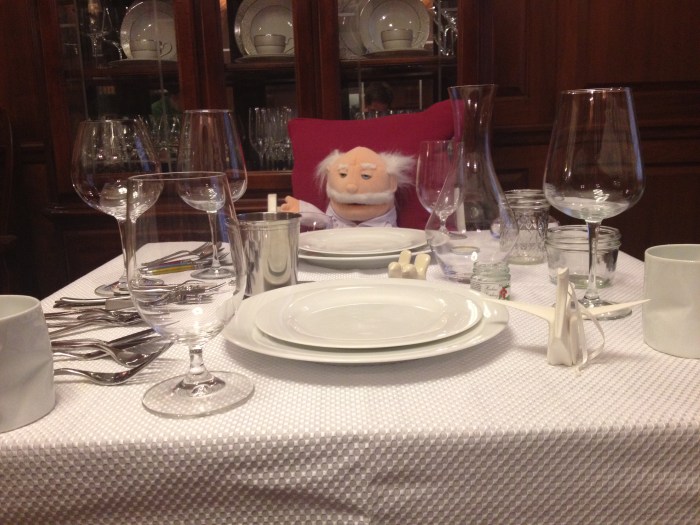 g and I easily sourced our table and chairs, but we had to decide what was going to go on the tabletop. There were so many options of glasses and utensils that we needed to visualize it. Fortunately, Dr. Moody (a gift from lc) was ready-willing-and-able to help out: