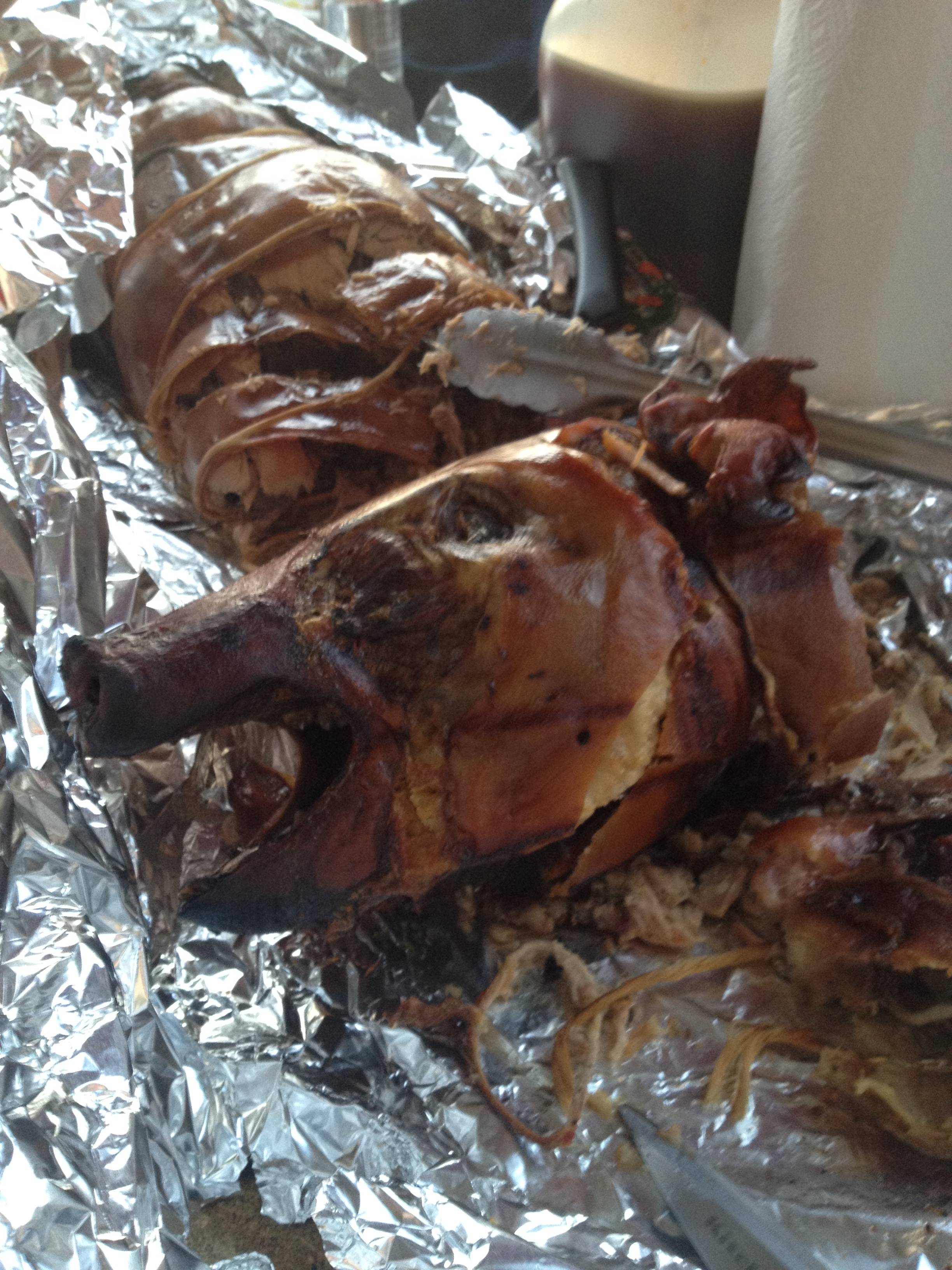 w’s fiance wasn’t kidding when he said he would supply “lots of meat”. g and I were thinking, “charcuterie platter?” No – this was WAY better. And it didn’t just have shock value – it was a damned tasty pig. Super-succulent. And it also had a gallon of what I can only imagine are pig drippings in case you wanted to have some jus on the side. (Speaking of which: kp, did you freeze that stuff?). This was perhaps one of the most brilliant moves I’ve ever seen at a potluck-y celebration – so much so that I will certainly steal it. If anyone knows where the pig came from, comment on the bottom and I’ll add it.