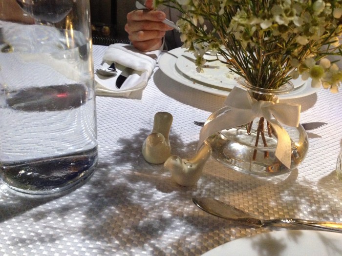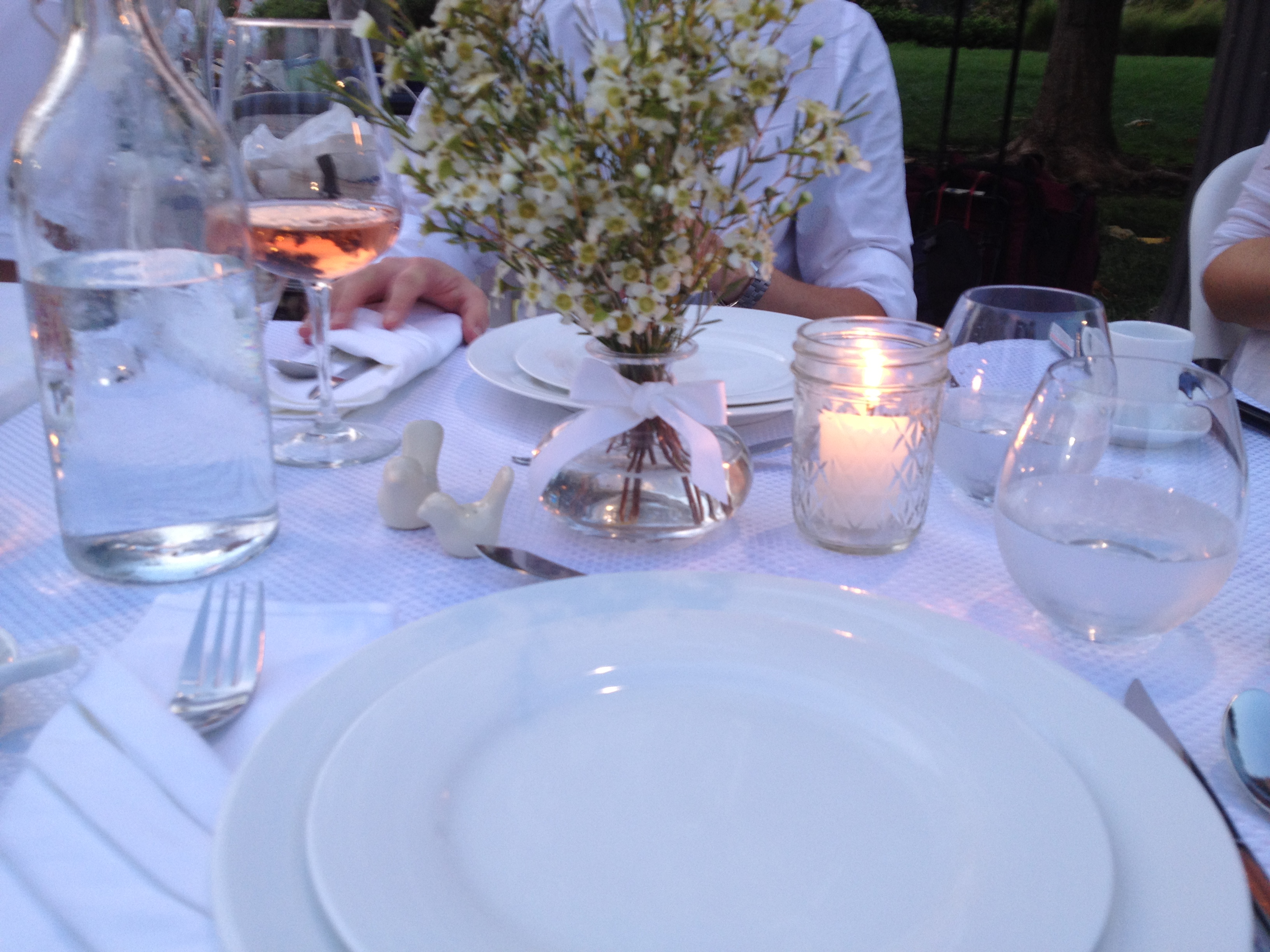 The official g & t mascots of Diner en Blanc … hiding under the shrubbery … we should have won “best table” for them alone … nevermind the edited, classy display of properly placed utensils, a single vase, a single candle, real steak knives, antique cheese spreader-thingees, big wine glasses …