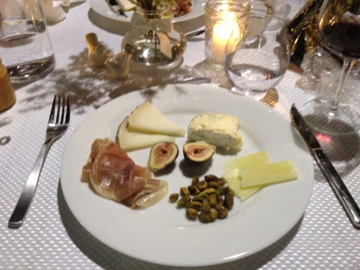For the cheese plate, we had some Pecorino Fulvi, a triple creme goat/cow blend from GTC, and garrotxa. This was accompanied by garlic dulce de leche (not pictured), some pistachios, prosciutto, and fig. It was a very interesting assortment of mild cheeses – fun to mix-and-match with accompaniments and wine. By now, we moved on to Erath “Le Jour Magique” White Pinot Noir … it rocked my socks again.