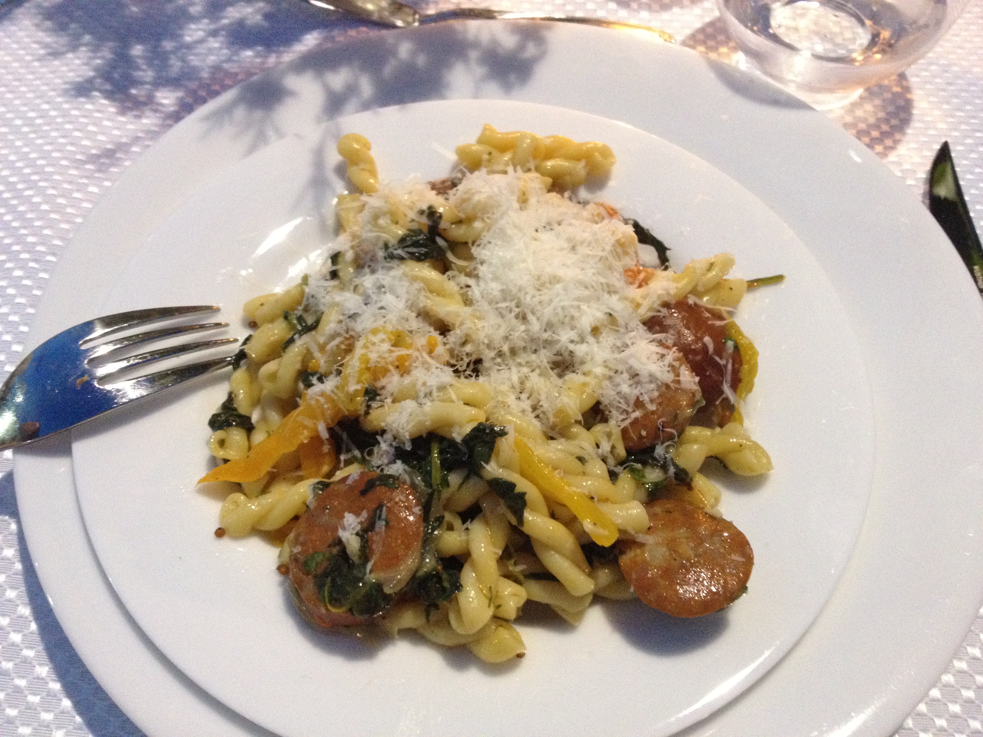 g whipped up a pasta dish inspired by something her mom crafted the other day. The main idea was pasta and cheese and chorizo and wilted spinach and multi-colored bell peppers for some crunch. g’s still got it! And, of course, we microplaned some more cheese at the table. For this course, a pulled out a delightful red he found at Moore Bros. I was worried at first that it was going to overtake the summery pasta, but the tango was pleasant (there was a good amount of cheese in the pasta, so there was some richness and flavors in there to compete with the red). The pairing probably wasn’t “perfect”, but of course a also had no idea what was going to be in the pasta, either (we literally called it “g surprise” when we made up the sample menu).