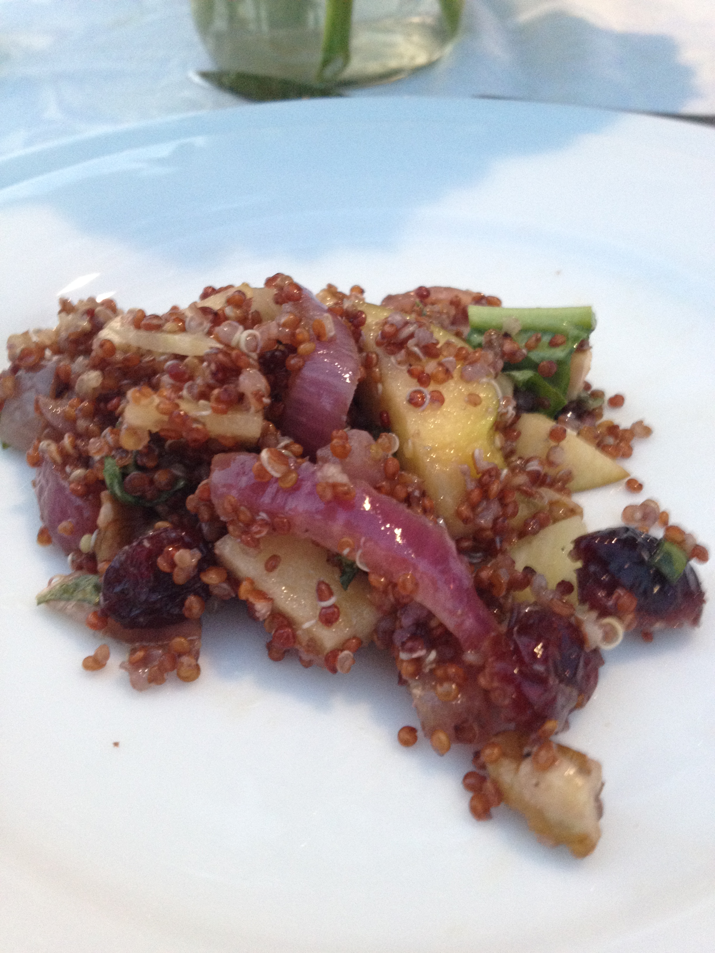 v made a quinoa salad and it was scrumptious. v said that it was based on a recipe she found here – except no gouda and a different vinegar; it turned out to be a feast for the eyes as well as the mouth. We paired it with a rose that a picked out from the PLCB and we were in heaven (seriously, this may have been the best rose I’ve had all year … it’s been such a tough year of roses for me – nothing like a legit Bandol to really show the world how to do a proper rose). I could not think of a more fitting start to an outdoor summer meal.