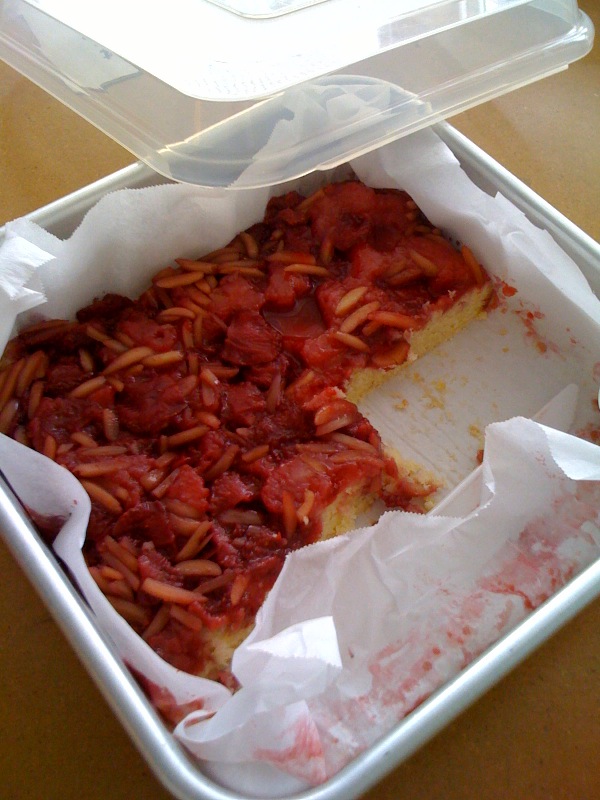1) j made a variant of this using strawberries and was happy with the results. I had my doubts as strawberries have a lot of water. Alas, j’s no liar – I made it with strawberries and it was quite good (you get a nice syrupy topping) – just do your best to dry the strawberries as much as possible. Here’s a pic (I also used a 9″ square pan in this case because our pie pan was being used for … a pie).