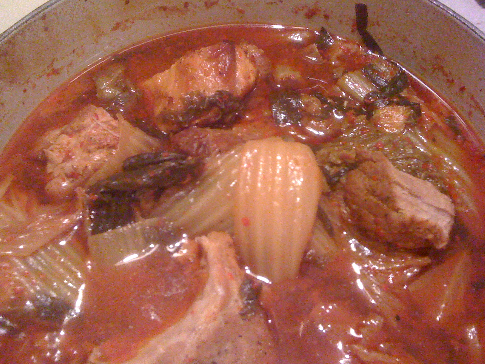 t says: A while ago, we posted a kimchi jigae recipe, but it was kind of a cop-out – it used a pork shoulder that was cooked for another dish and then added the leftovers to kimchi … That needed to be fixed – kimchi jigae deserves its own recipe. ha has her own way of cooking it, but even she admits that it’s something she thought up – not a formal recipe. Plus, sometimes the meat just ended up very tough to chew. So I set out to re-do kimchi jigae, but this time in the method of a braise … but it had to be done outside because cooking kimchi indoors for hours on end produces an ugly smell. I did some experimenting and this is what I’ve come up with. It’s a piece of pork, a piece of brisket, and some tofu, braised over a long period of time. While using just one or the other is permissible, I kind of like having a mix of meats so this way I can eat the same dish over a few days and not get bored of it.
