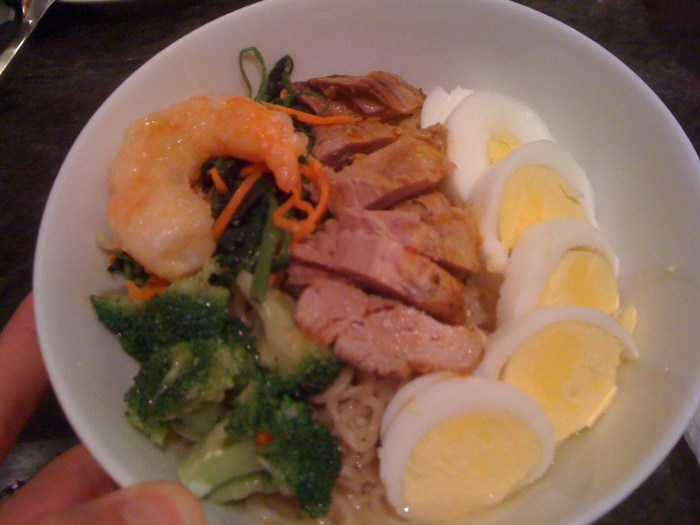 No, it’s no Momofuku ramen, but if I close my eyes, I can pretend that it’s a balanced lunch (it’s got three pieces of broccoli in there, right?). One day, I do hope to master David Chang’s ramen, and maybe then I won’t need Sapporo Ichiban anymore … (but I’d still eat it anyways).