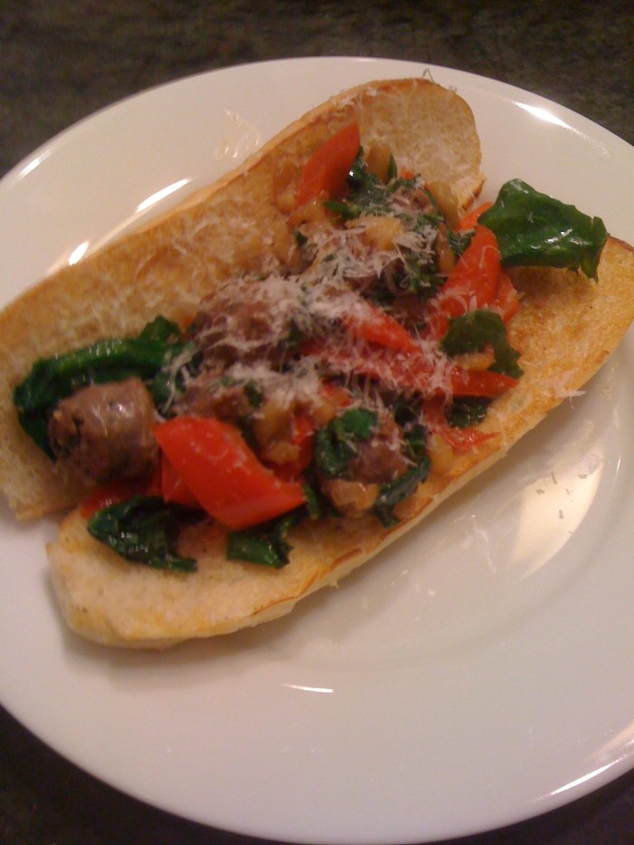 now, t is a bit more busy and i am stepping back in when i am home early enough from my new(er) job. one such meal was the beauty shown below — rosemary lamb sausage (procured from an excursion to the italian market with a and v), sauteed with red bell peppers, spinach, apples, and cinnamon, served on a toasted roll and topped with fresh pecorino.