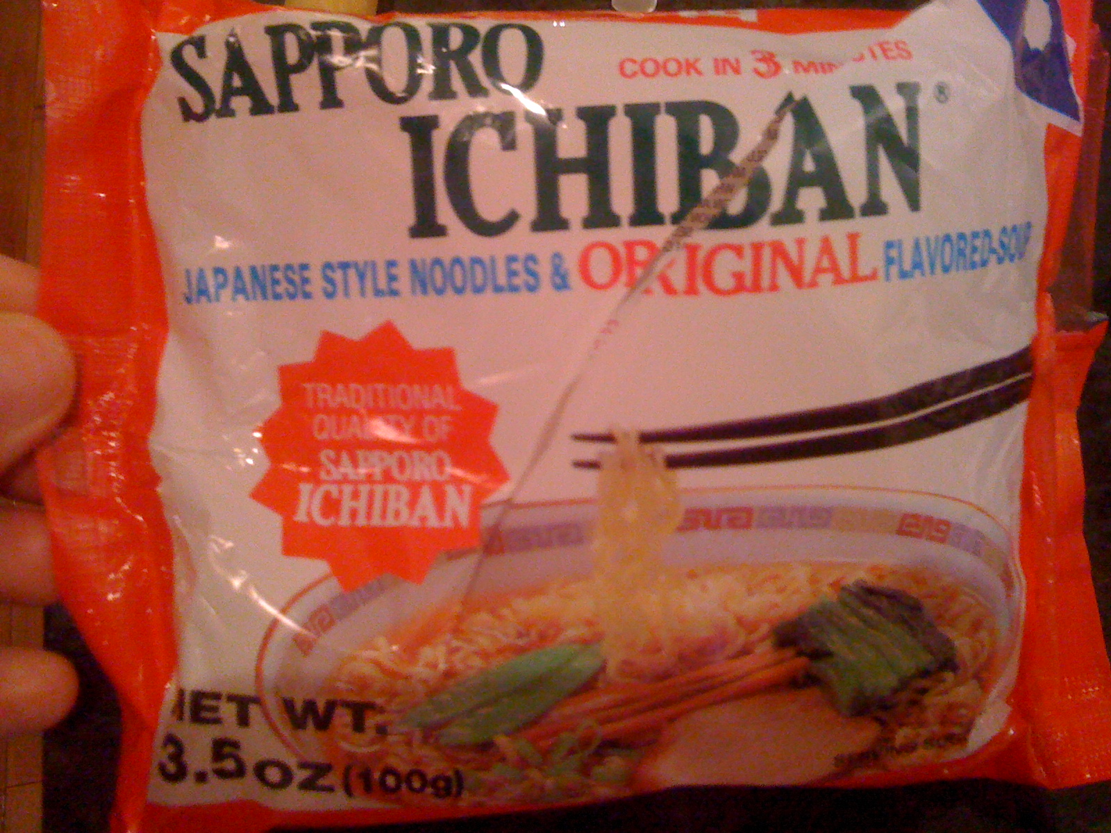 t says: The other day, a, v, g, and I were discussing childhood foods that we still enjoyed eating today … even if they are a little – shall we say – “unrefined”. For instance, a has found himself eating Spaghettios once or twice a year; I find this to be revolting. I, on the other hand, have been known to eat a Pop-Tart or two in my day (Cherry is the best); a finds this is ridiculous but not necessarily surprising (I believe his exact words might be: “you would … you would!”). g has a secret crush on sugar doughnuts filled with strawberry jelly (she can resist a lot of sweets … but not that one). This is when v reminded me of one of her food weaknesses: ramen. Mmmmmm. Ramen. I, too, love ramen. But not just any ramen – for me it has to be Sapporo Ichiban: