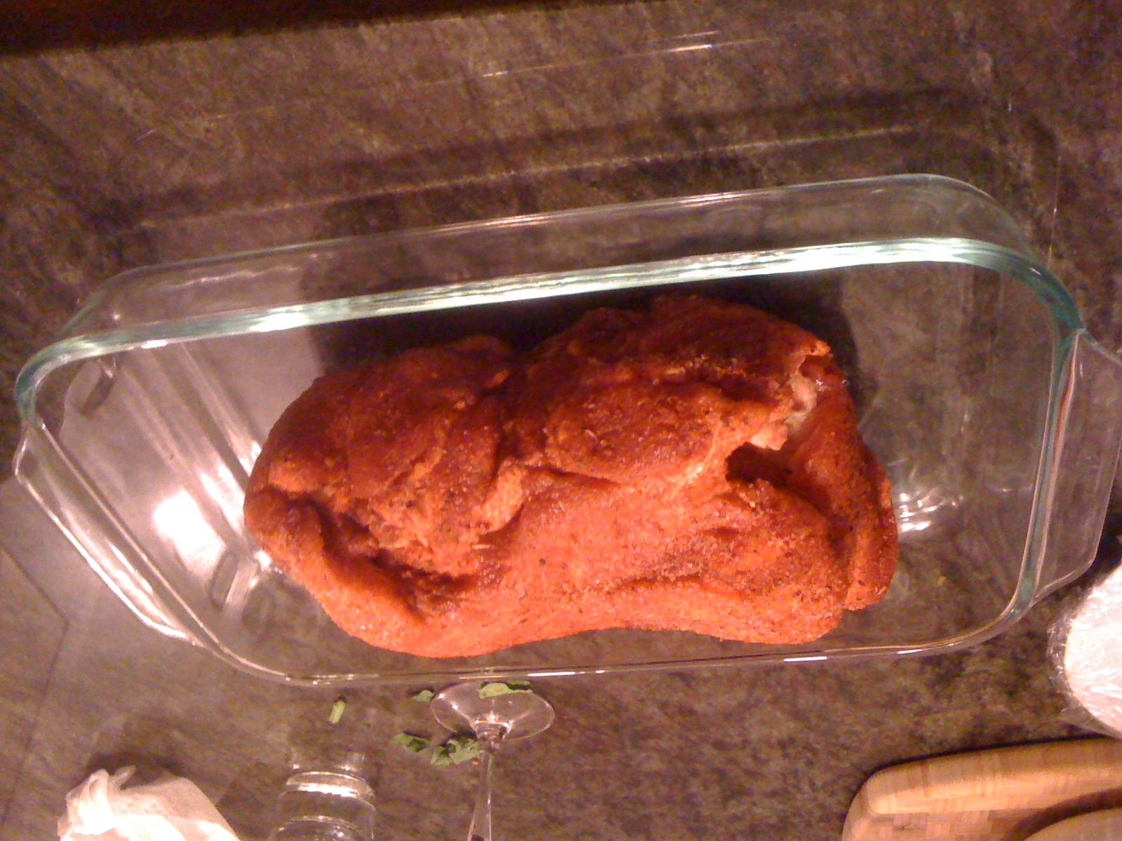 -1) The night before you want to roast the pork, mix up the salt, sugar, and spiced rub in a 0.5:1:1 ratio. Rub down your shoulder in it. Stick it in the fridge, covered, for 4-24 hours. Apparently, if you go for more than 24 hours, the pork is too salty – I have no idea if this is true.