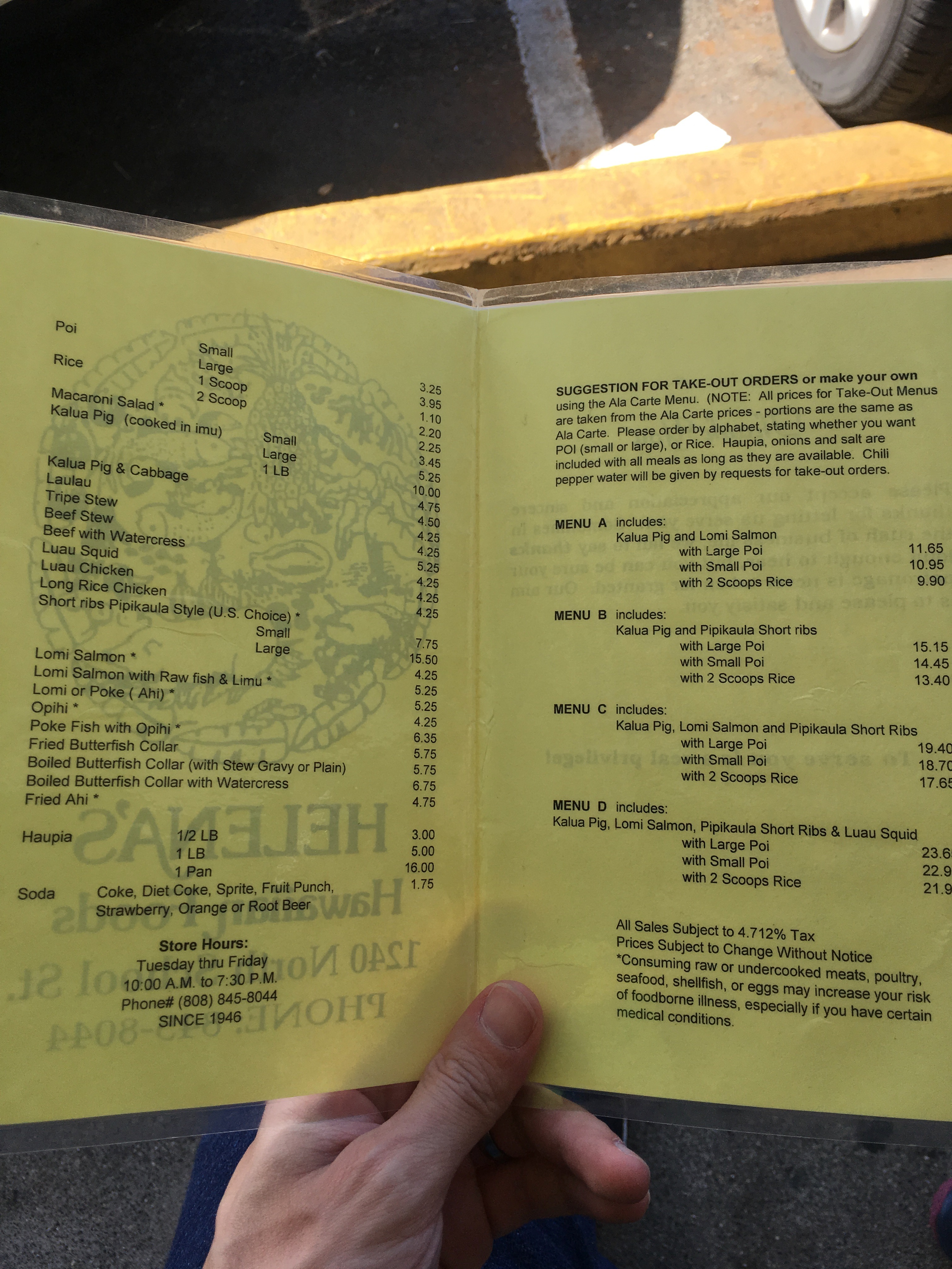 Indeed, the first place one is told to visit in Hawaii is Helena’s. Home of “traditional Hawaiian” cuisine, g and I didn’t quite know what to expect. I have to say that there was a bit of trepidation when we pulled up to the parking lot – it doesn’t look like much from the outside, occupying one space in row of shops in a relatively residential neighborhood. But we knew it was legit because it had a line … quite a long line … meanwhile the restaurant literally in the next space over had absolutely no one in it (I kinda felt bad for them). Had we been there for longer, I would have considered trying out their food, too … but alas, with only one stomach, we had to go for Helena’s.