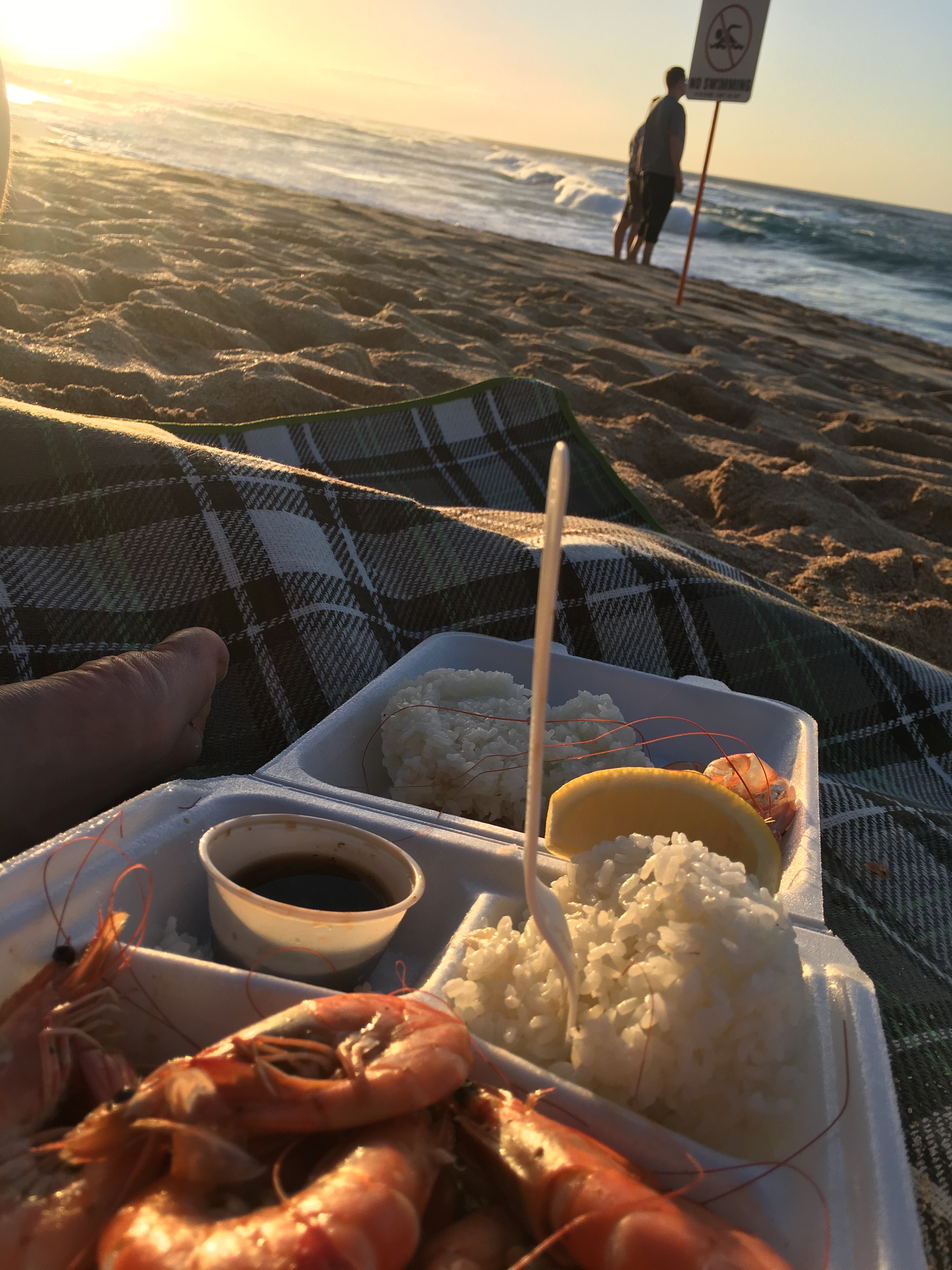 And now here was probably our best meal of Hawaii. After watching a junior surf competition on the north shore, we stopped by Romy’s prawn and shrimp shack. The layout is similar to a Philly cheesesteak shop – you order at the window and they prep it right there. While it seems that most people get a fried version, g and I went for the steamed option, as this would allow us time to get to the beach and watch the sunset without having to worry about fried-ness getting soggy. And it. was. amazing. The shrimp were huge, perfectly cooked (surprising!), and funt o dip in the sauces (we mixed together the soyu and garlic). We could not imagine a more Hawaiian experience than sitting on that beach with our shellfish.