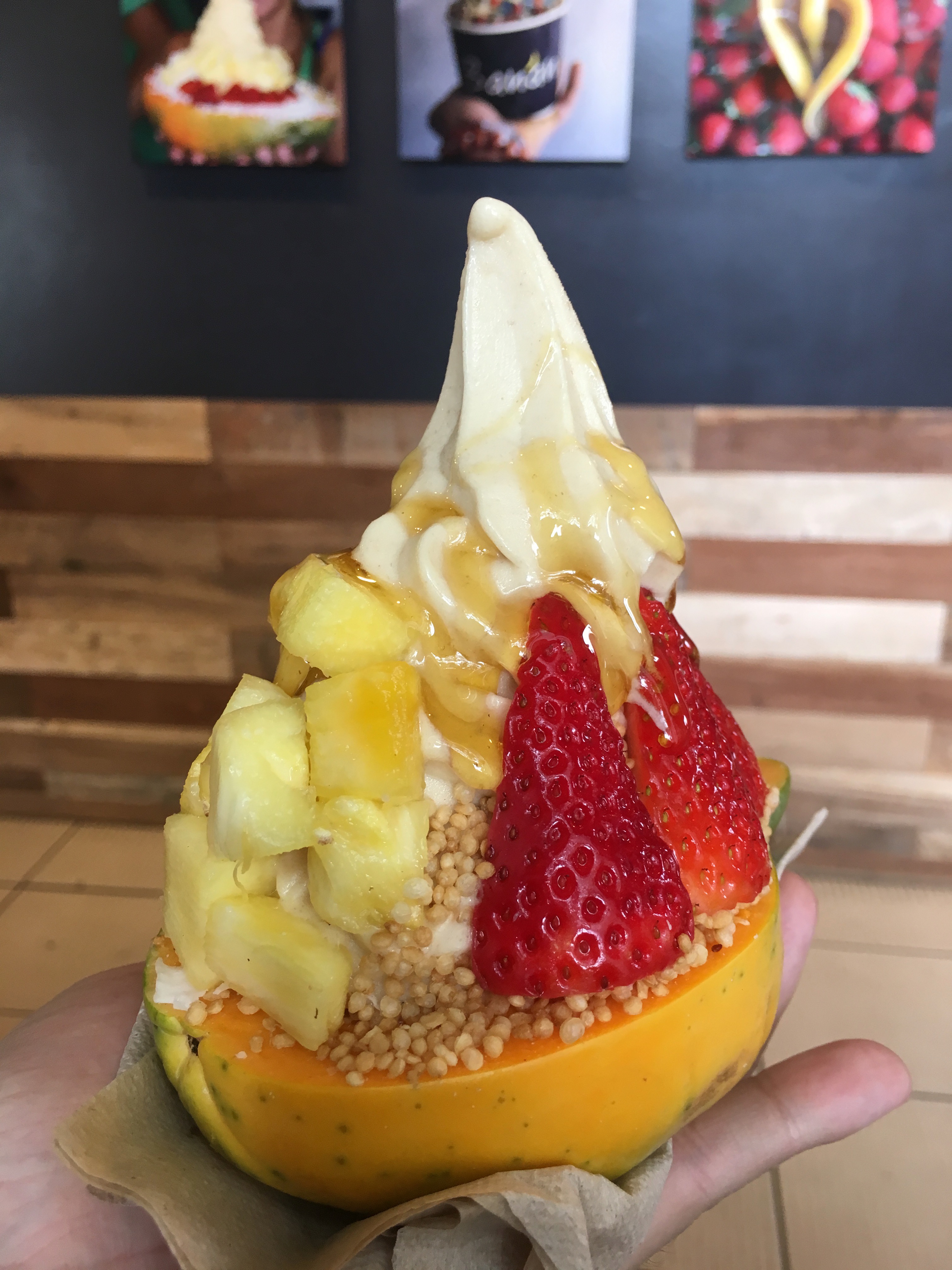 And just for k, we went to banan … That’s not ice cream, so much as whipped frozen banana … served with toppings … and served in a papaya. That’s right! In a papaya! g was loving it … (although I wished it was another one of those shaved ice concoctions, above …)