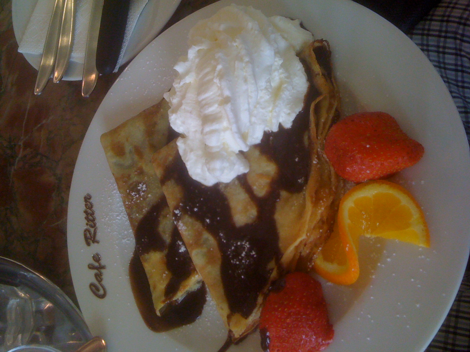 Cafe Ritter's "chocolate pancake dessert" (which I ate for breakfast). It's like crepes and nutella (and some fruit). It was so frickin delicious (although probably not that different than eating straight-up nutella).