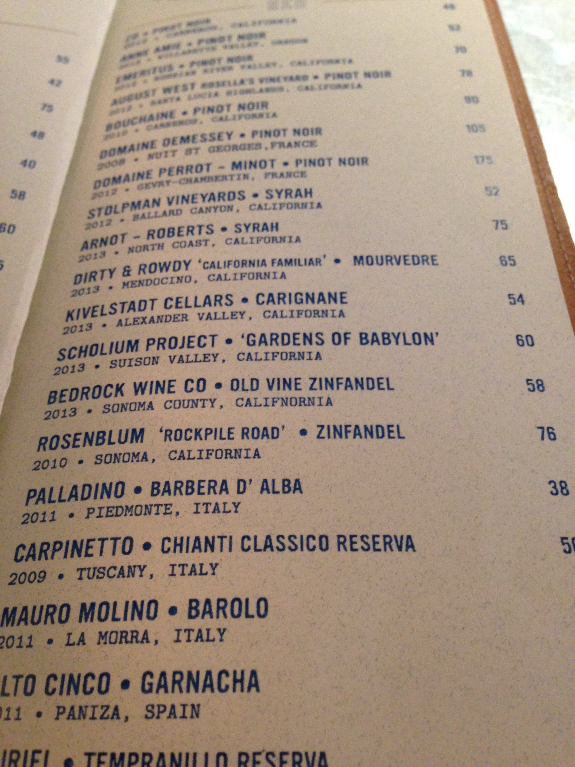 … and a “serious” wine list of bottles including Scholium Project, Bedrock, Kivelstadt, Matthiasson (none of which I could afford, but it was nice to know they had). So the food and wine was so good that i actually walked back to this hotel on days I was staying in another hotel just for the food!!