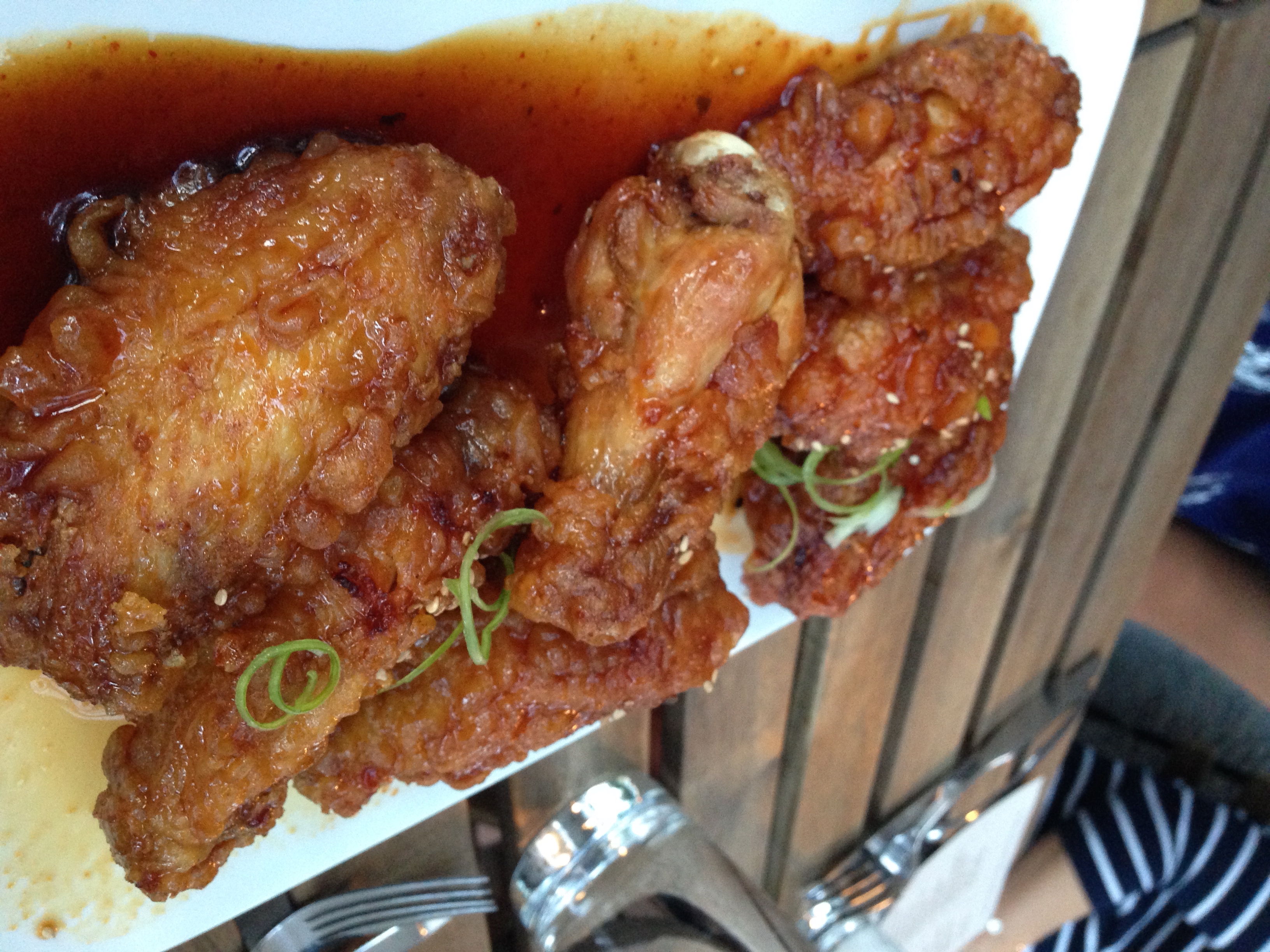 For some reason, wordpress won’t let me rotate this image, so I’m going to leave it all silly-like – as I feel that that is also representative of the experience that g and I had with my sis at the new restaurant “Southgate”. Advertised as serving Korean pubfare, we were there to check out the Korean Fried Chicken, a dish that even our server (who was kind of weird overall) boasted, “a lot of chefs in Philly who came to check us out, love our wings”. Our take: they sucked. Yes, the skin was indeed very crispy, which is a great accomplishment, but just because you have an inch-thick crust on a chicken does not make it an excellent piece of fried chicken. The skin needs to be crisply fried, with a fun, delicate crunch – not like eating through a layer of cardboard. Furthermore, the underlying chicken wasn’t particularly tender or moist. The pieces, themselves, weren’t even large enough to warrant the steep price! The other dishes were similarly underwhelming, including the steamed buns that were so bland I had to dip them in the above fried chicken sauce, which was terribly sweet. What a sad meal! Fortunately, the company was great and was able to make up for it!