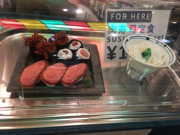 We obviously didn’t go for it, but I figured the translation was worth posting. Ok, so now that I showed you the machine, I need to tell you that the place is super-tiny, with nonexistent standing room behind a counter of ~8-10 people. So basically I think people would queue outside and then proceed in when there’s room. Then, after you put in the money and make your selections, it prints out tickets which you put on the counter when you take your seat. Or – if you’re like us – just visit at 10am and there’s no line!