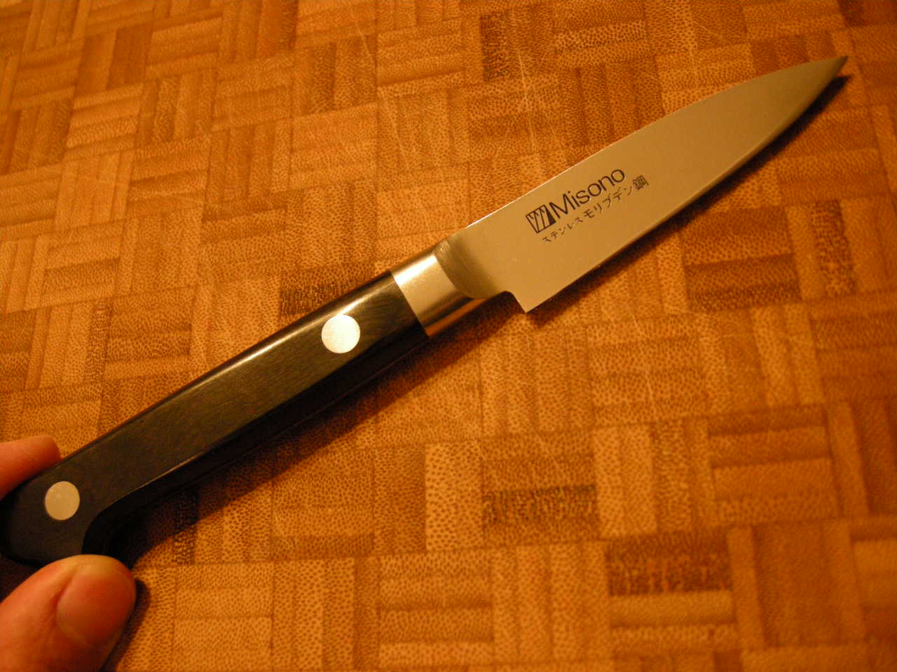 This is our super short and skinny paring knife – by far the best I’ve used. It also used to be a lot cheaper – but now Misono hiked their prices – yikes!