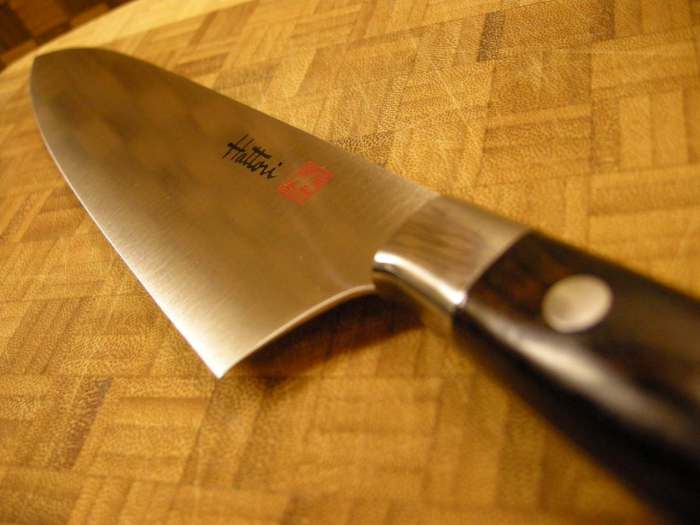 g’s go-to chef’s knife is a 210mm (~8.25″) Hattori FH gyuto. It’s a Japanese (i.e. actually from Japan), stainless, Western-handled knife with a shnazzy ebony handle. Similar to those Hattori Hanzo swords in the Kill Bill movies, this knife was designed/finished by a wizened old Japanese man named Hattori who has spent a life-time making really sharp pieces of metal. As you can see, it’s always ready to strike dramatically cool poses like “Blue Steel” and “Magnum”. And proving that “there’s more to life than just being really really ridiculously good-looking”, the steel in this knife takes a quite a wicked edge as well. (n.b. g prefers Zoolander to Kill Bill 1000000:1 … for me it’s more like 10:1)