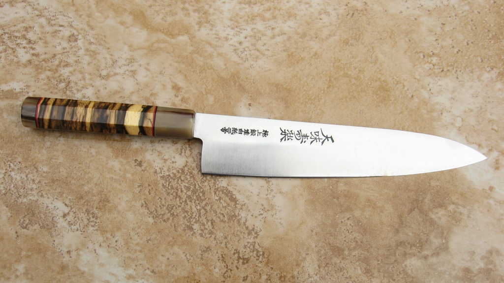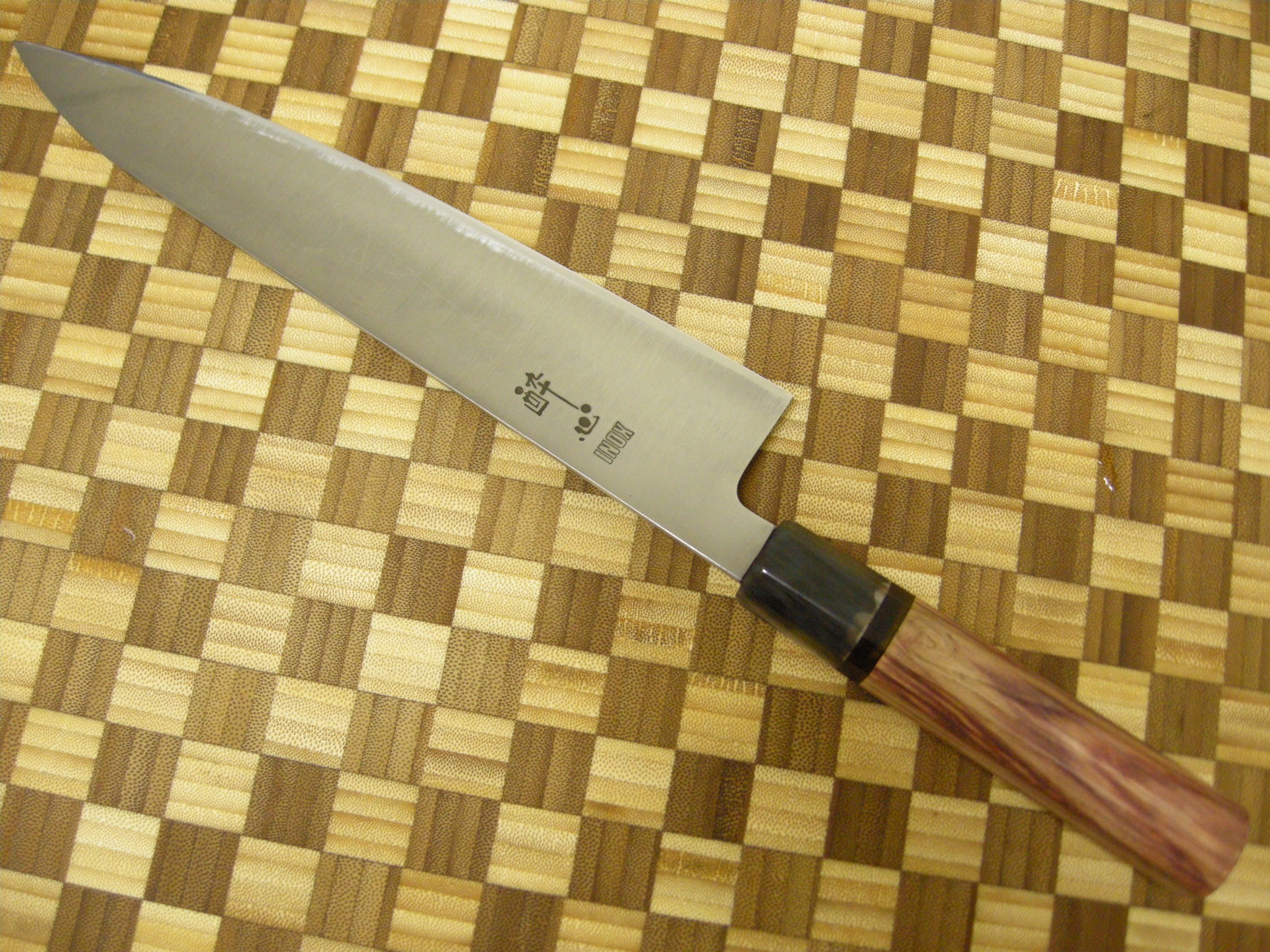 This is where my infatuation with kitchen cutlery began. It was a 240mm Suisin Inox Wa-gyuto (meaning it has that funny-looking Japanese-style handle). The blade was made of stainless steel and was ridiculously thin. The day I had to sell it (to afford a newer, longer, awesomer knife), I did feel a little sad. Zoe will always hold a special place in my heart – even if she was replaced by: