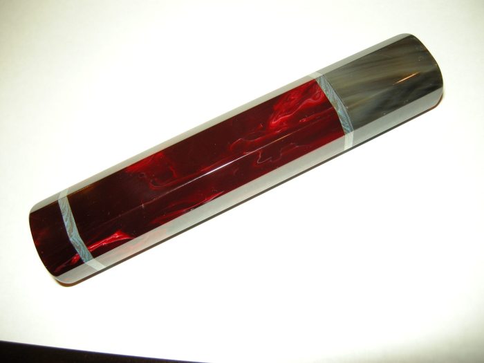 Coming in with a ~260mm cutting edge of semi-stainless steel, this Konosuke HD features a custom bakelite, buffalo horn, and faux damascus handle and a spine thickness <2.25 mm. And just in case the handle doesn’t look remarkable in the above picture – here’s a close-up: