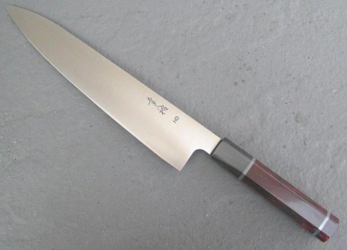 My first all-carbon knife: Hiromoto Shiroko 240mm with Wa- Conversion (it used to be western-handled). I liked the knife a whole lot, but it never put a smile on my face like Serena, so I sold it. It might mean that I missed out on a “collector’s item” – but it is better for a knife to be used than to become a drawer queen.