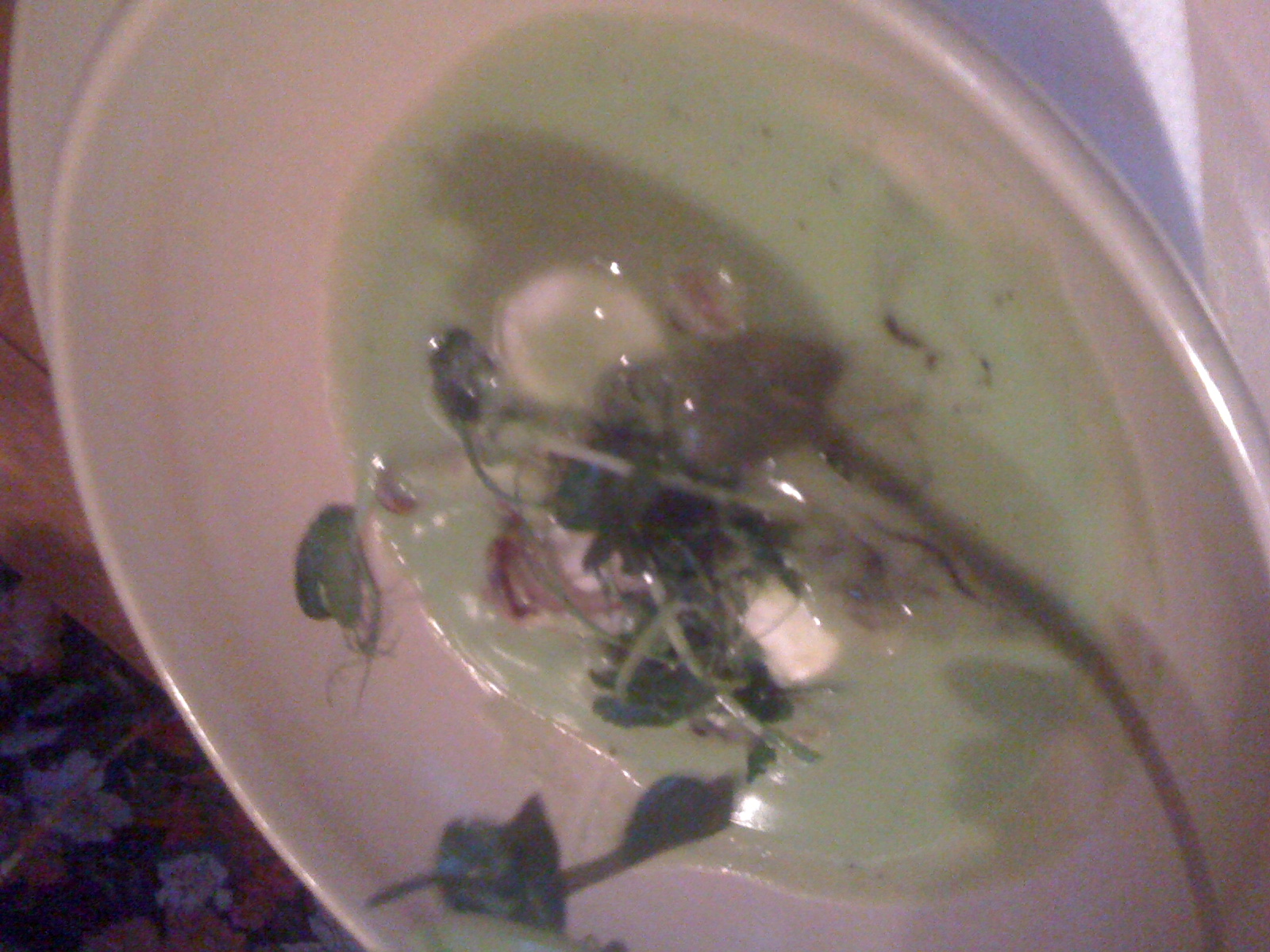 When the wine guy came around, g had another moment of recognition. It was Brian [Freedman]! It was the dude from “The Wine School”. A while ago, a few friends and we took a few-hour course on Italian wines at the Wine School (Groupon rocks!), and we were super-impressed with both the presentation and quality of wines sampled (and quantity, too!). We highly recommend it. Brian was our instructor, and, while most of his jokes were “canned”, we liked his enthusiasm. He was no less enthusiastic at the pop-up restaurant. His passion for the wines he described as well as the descriptions, themselves, persuaded us each to venture an additional glass of alcohol. g and I went for two different glasses of red (mine was Spanish “Cap De Barbaria 2005”, g’s was an Austrian “Sattler St. Lauren 2006”), while maybe cm went for some French bubbly? They were all delicious and went well with the food – but I’ll leave the descriptions of the wines to those wine professionals out there.