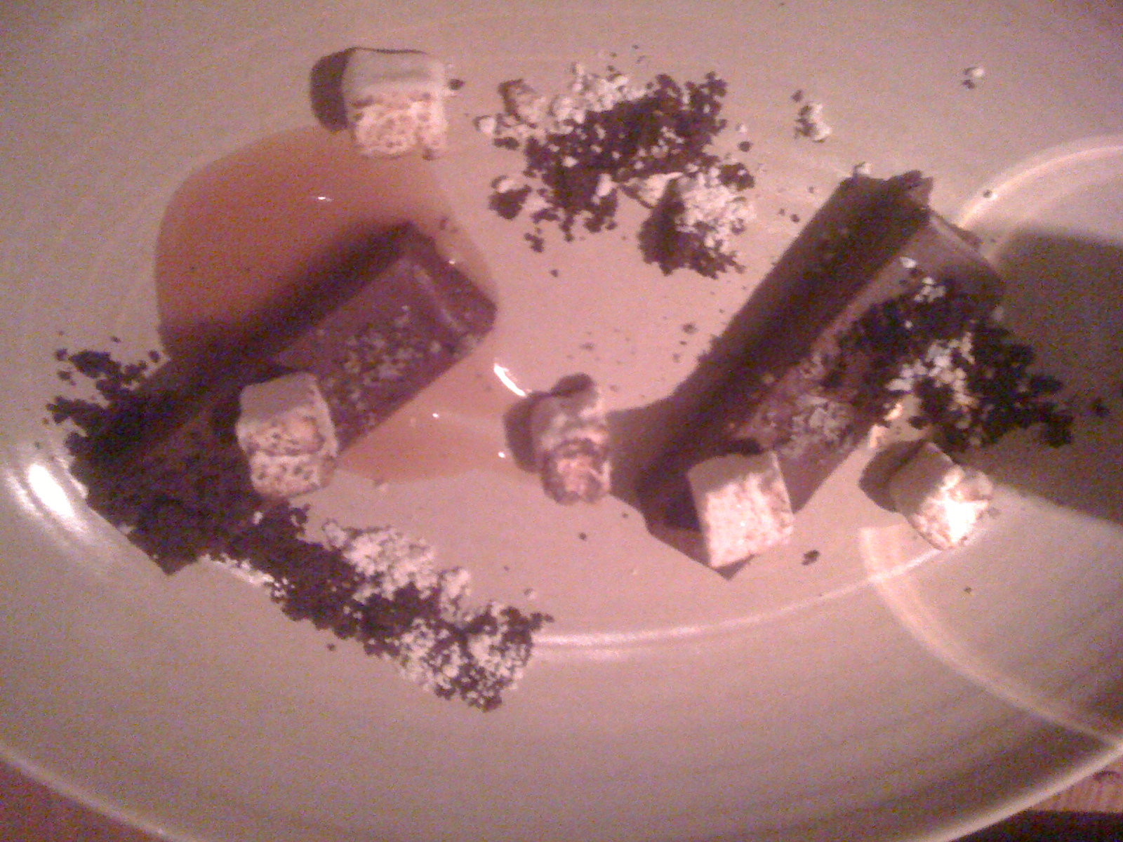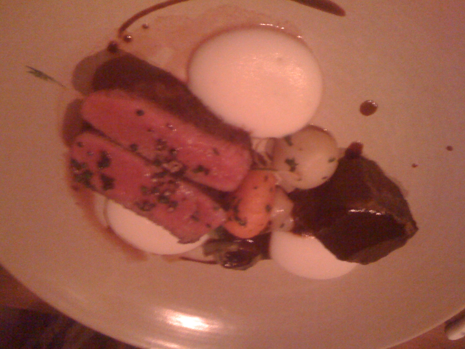 g went for a manly entree (it seems like she always gets the manly entree) – but she promised to share (I was going to get it, too, but it’d be dumb to get two of the same!). Those puddles of white were almost like a potato foam, and it was accompanied by a turnip and a carrot, both of which were divine (a divine vegetable? yep – beautifully cooked texture). But the real star was that rib (?boneless short rib?) hiding under that thick brown glaze on the left. It … was … ridiculous. It’s probably the single best short rib I’ve ever had – including the short rib we had at the Inn at Little Washington. That’s no easy feat. g wondered if it could have taken on the Inn’s sous vide filet as well, but I’m not quite sure that this braised piece of meat could have matched the texture/flavor imparted by the sous vide method – it was close, though.