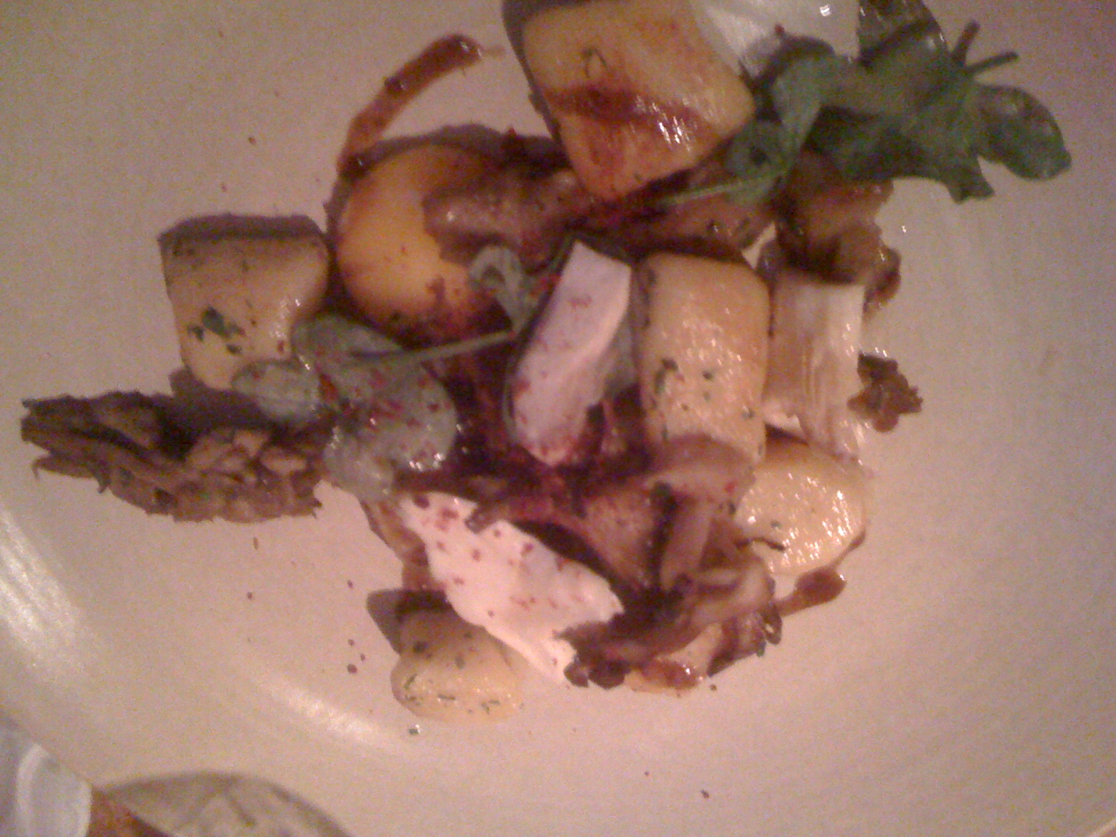 Gnocchi and mushrooms. No big deal, right? In fact, you always see gnocchi and mushrooms (I think we’ve had it at Django, Talula’s Table, Osteria – I’m pretty sure I’ve seen it at other Italian places and contemporary American places all over the city). So what? Brace yourself. This, my friends, was no normal gnocchi-and-shrooms. First off, there were a few different kinds of mushrooms on the plate – so it was a bit of fun trying each. And yes, these gnocchi were a step up even from the normally exquisitely texture Django/Talula gnocchi in that they were lightly pan-fried/roasted/seared/something, so there was a slight browning on the outside, giving it a bit of a super-thin-shell. And there was the round yellow egg yolk that added a wonderfully unctuous sauce-like mouthfeel. But it didn’t end there – because if it did, it would have only been on par with ever other gnocchi-and-shrooms dish in the city. No, there was something different – something weird about this dish – and I still just can’t figure it out! Everything I’ve described to you so far would suggest that this was going to be a rich-and-heavy dish (courtesy of gnocchi and egg yolk). But no. There was something else going on. It had some sweet, but it had some liveliness to it. Or was it some kind of acid. Whatever it was, that some kind of something livened up the dish. It made the gnocchi, mushrooms, and yolk have a lighter, zippier, more playful taste than what I was expecting. At first I thought it was maybe those little red specs, which at first I thought were paprika, but I couldn’t get any of that smoky paprika flavor on the palate (so now I have no idea what those were, either). You know – it was probably something so simple that I’m overthinking it (someone’s going to be like, “duh t, it was balsamic vinegar”) (EDIT: raisin puree!! that’s what it was!), but it was definitely there and made this one of the best gnocchi dishes I’ve ever had (I would have said best, but it’s been a while since we’ve been to my former favorite: Babbo). Nevertheless, it at least so far beat out Vetri (Vetri’s was a volatile gnocchi – I prefer a denser gnocchi), it beats out the old Django/Talula’s, it beats out Gnocchi and La Viola and Mercato and Melograno and Modo Mio/Monsu … Maybe I’ll leave it as the best gnocchi dish in the city? Will that piss off the Italians? Probably. *Shrugs* I’ll happily eat my words if they give me a better gnocchi dish.