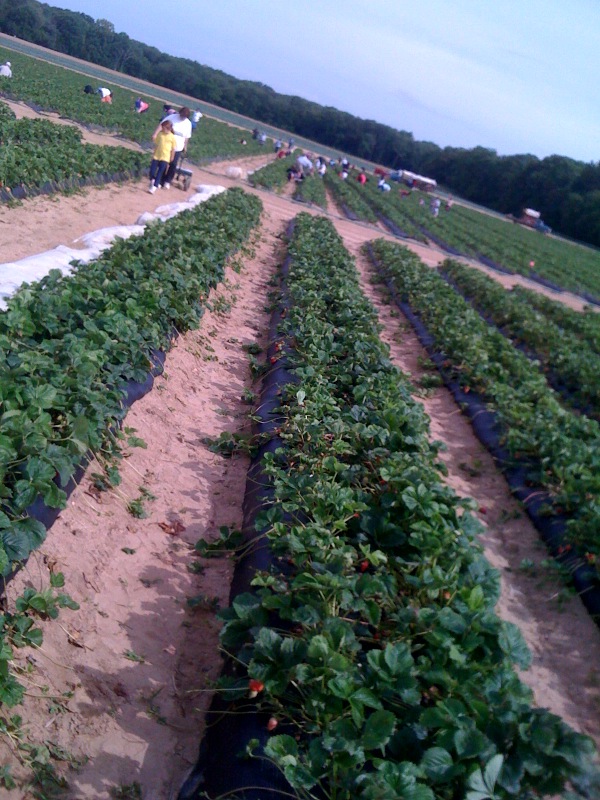 t says: This past weekend we went strawberry picking at Sparacio’s in Rosenhayn/Bridgeton, NJ. The weather was beautiful (we were there at 9:30 in the morning) so we fooled ourselves into thinking that bending over or crouching to pick strawberries was “exercise”. If you bring your own container, you don’t have to pay for one from Sparacio’s – not that the $1 for a cardboard crate that holds several pounds of strawberries is absurd. The going rate is $1.45 per pound of strawberries – you get to keep on picking until you’re satisfied – no limits [that I was aware of]!