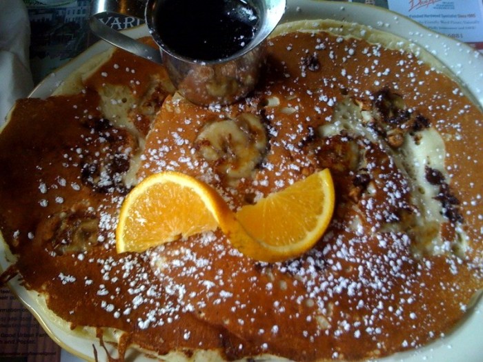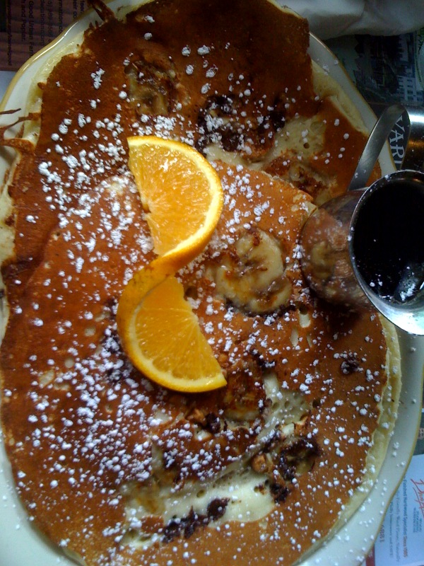Because it was my Birthday, I felt like I could ask for a special batch of pancakes to be made with all of the ridiculous things I wanted: chocolate chips, peanut butter chips, and bananas. Their response: “no problem”. Awesome. Above you see a pic of the resulting masterpiece which was actually very good. A beautiful golden brown, it wasn’t the fluffiest pancake I had ever had, but because it’s approximately 50% of “stuff” that I requested, I guess it’d be foolish of me to dock them points for that. The pancake itself was pretty good, but really, it’s all about the other stuff – how can you go wrong with chocolate, peanut butter, and banana? Of course, I do have to give Honey’s the credit for even distribution of fillings and having just the right ratios to ensure that no one flavor trumped the rest. On the flip side: I’m not sure what the orange did on top – maybe if there was some kind of orange-twinged syrup, that would have been a pretty darn good addition.