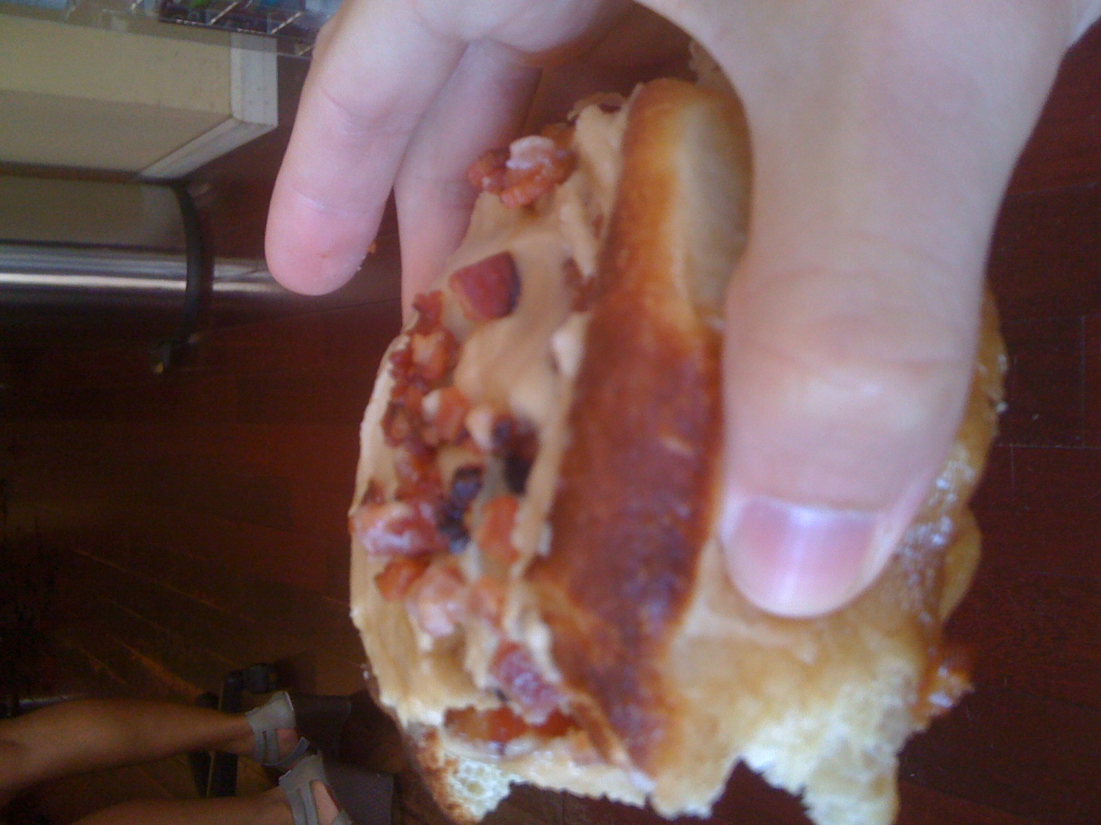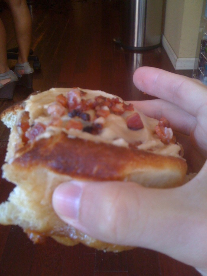 Ok. Take a cinnamon roll, but replace the cinnamon with maple and bacon. Now, I will admit that I was skeptical at first read the sign and laid my eyes on this beauty. Just because you sprinkle bacon on top of something doesn’t make it super-awesome. It makes it better, but not necessarily super-awesome. In my humble opinion, a breakfast pastry’s success depends first and foremost on the execution of the dough … yea, it was perfect. The bread was gloriously soft; it was actually difficult to do the above picture because I wanted to grab it securely without crushing it, but it was so soft that it kept drooping in the middle. Note – it was soft, but not the least bit mushy. The bacon was delicious, cut into appropriately sized pieces with just the right balance of crisp-ness and give. From what I recall, bacon was not studded in the bread, itself, which would have been interesting, however, there was plenty of bacon on top to make up for it. Finally, the icing had a beautifully pasty feel (i.e. instead of a watery glaze or a too-thick fudge), and there was enough of it so that if you got one bite, the amount of glaze on top would distribute and coat the rest of the pastry in your mouth. j and kp, I’m sorry you missed it.