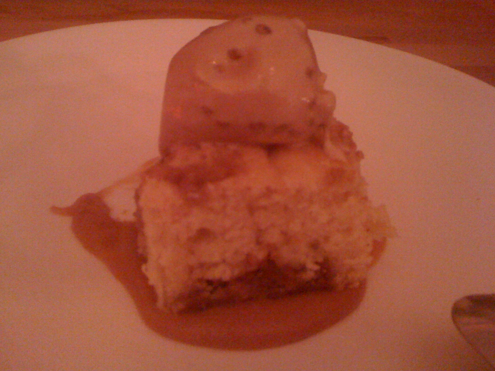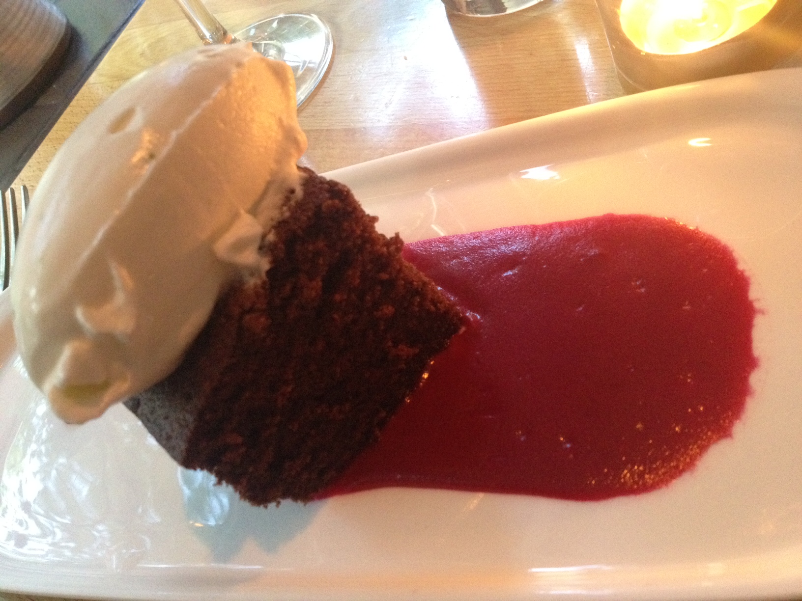So, after we remembered out experiences with the coffee cake the last time we were here, g and I knew that we shouldn’t underestimate their dessert prowess. But unlike “coffee cake”, this dessert seemed like it was going to bring in a new twist: chocolate and beets. I was skeptical. Don’t mess with my chocolate by putting crap in it it doesn’t need (citrus, berries, and bacon are acceptable). I am glad to report that this dessert was awesome. Not – it wasn’t as sensational as the coffee cake, but it was a nice, filling dessert with moist chocolate cake (as moist and fluffy as a boxed cake, but not as sweet), with some creamy whipped topping (I forget what it was flavored with) and that beet sauce that turned out to be a wonderful accompaniment (kinda like how raspberry+chocolate works – this works in the same way – the beets came off as kinda-fruity, which was great!). So in the future I might flirt with chocolate+beets some more.