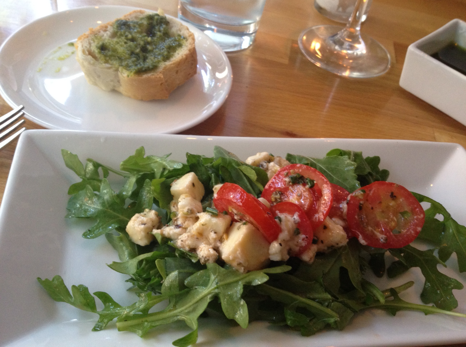 So we started with a pretty simple salad. On one hand, it was a simple as simple could be (arugala, tomato, cheese), but on the other, it was really the first green thing I had eaten in at least a week, if not longer – so for me, it was like a plate of some sort of exotic vegetable I had never seen. So yes, it was tasty (plus, arugula tends to have that pepperiness to it – so it is more exotic than romaine after all). Was it blow-your-face-off-good? No. But when’s the last time arugala+cheese+tomato blew your face off?