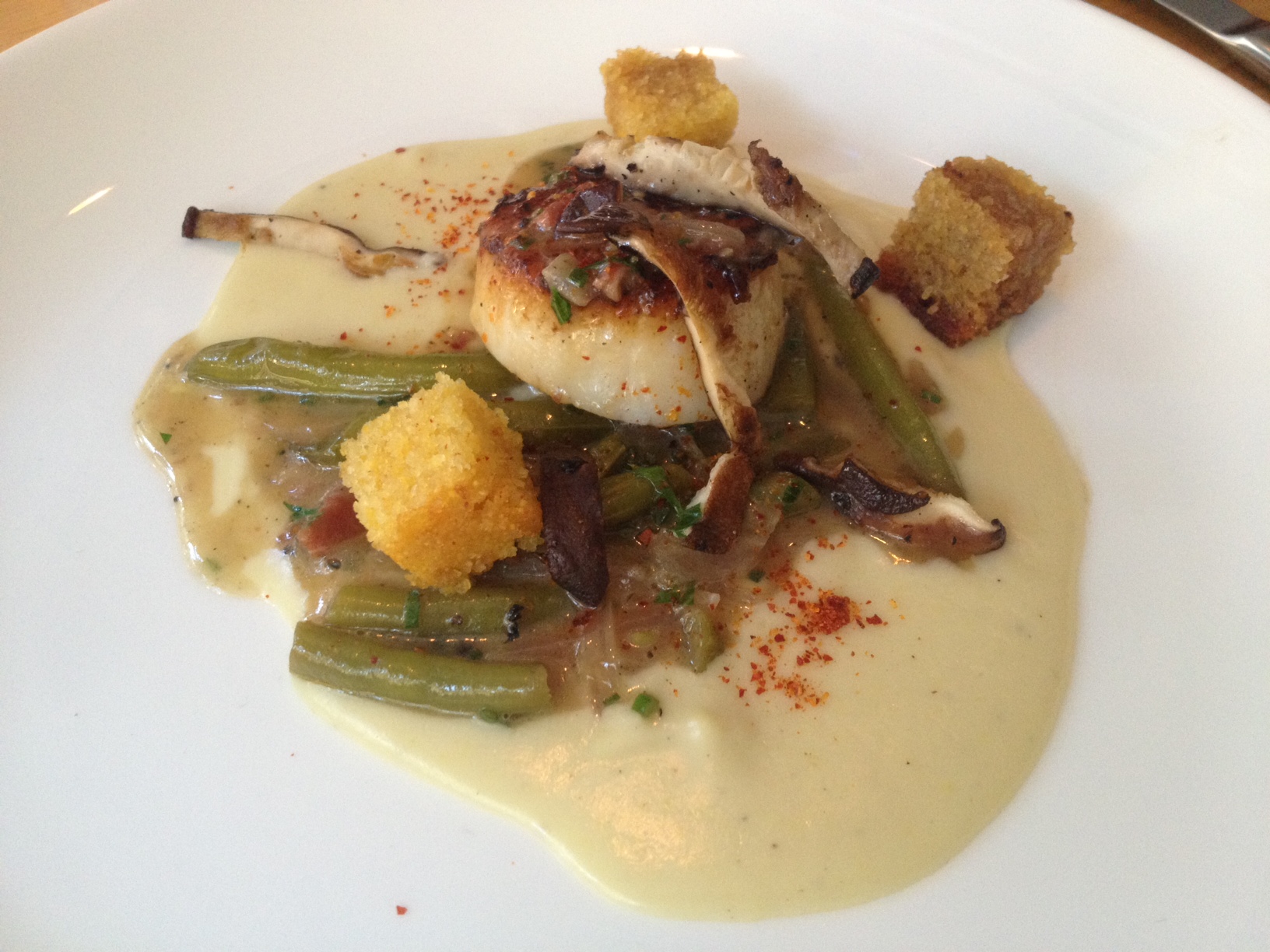 This was the second dish to blow my face off (i.e. if I still had some remnants of a face after the first dish). So it started with a perfectly cooked scallop (an absolute requirement for any place trying to bill itself as seafood-centric). Check. Add a richly flavored corn-essenced gravy. Check. Toss in some mushrooms that were so good that even g ate them. Check. Add some green beans that were cooked-yet-crisp-yet-deeply-flavored as well as some cornbread croutons. Check. The result was this weird concoction were something as light as a scallop was made to feel so rich and earthy that it almost made me wonder what sort of mysterious grass-fed, hoofed beast these scallops must have come from. To borrow some language from some of my favorite people [of which to poke fun]: amaze!
